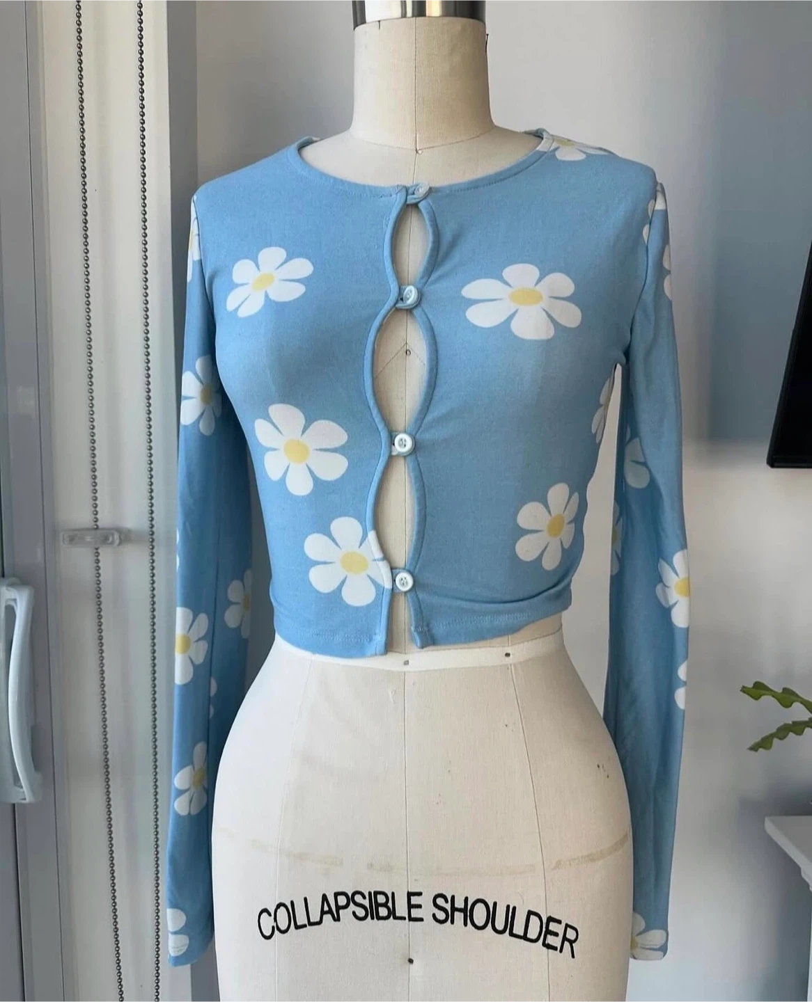 Light blue long-sleeved cardigan with a white daisy print all over. It features a button-up front with a unique cutout detail. It's made of a stretchy knit material.