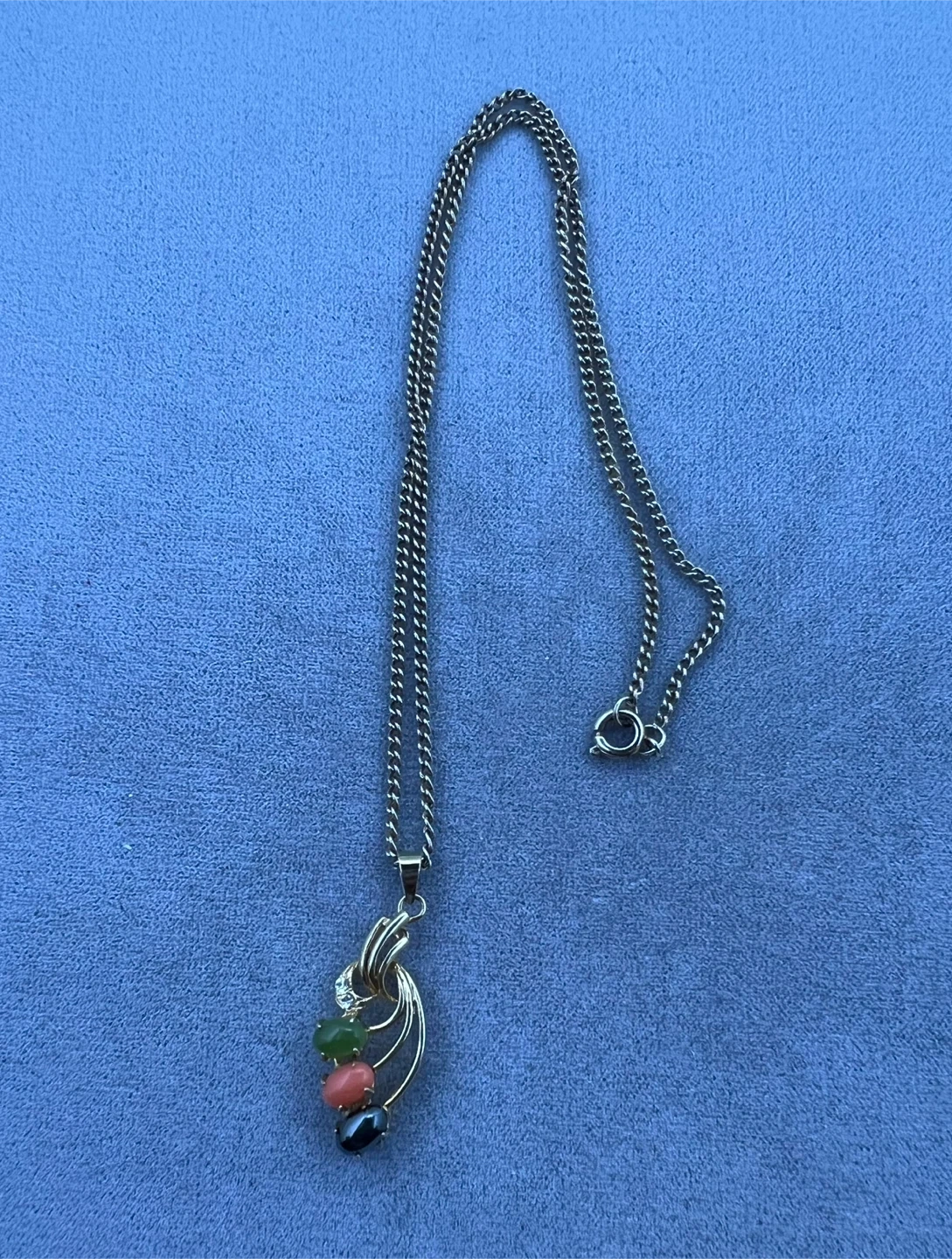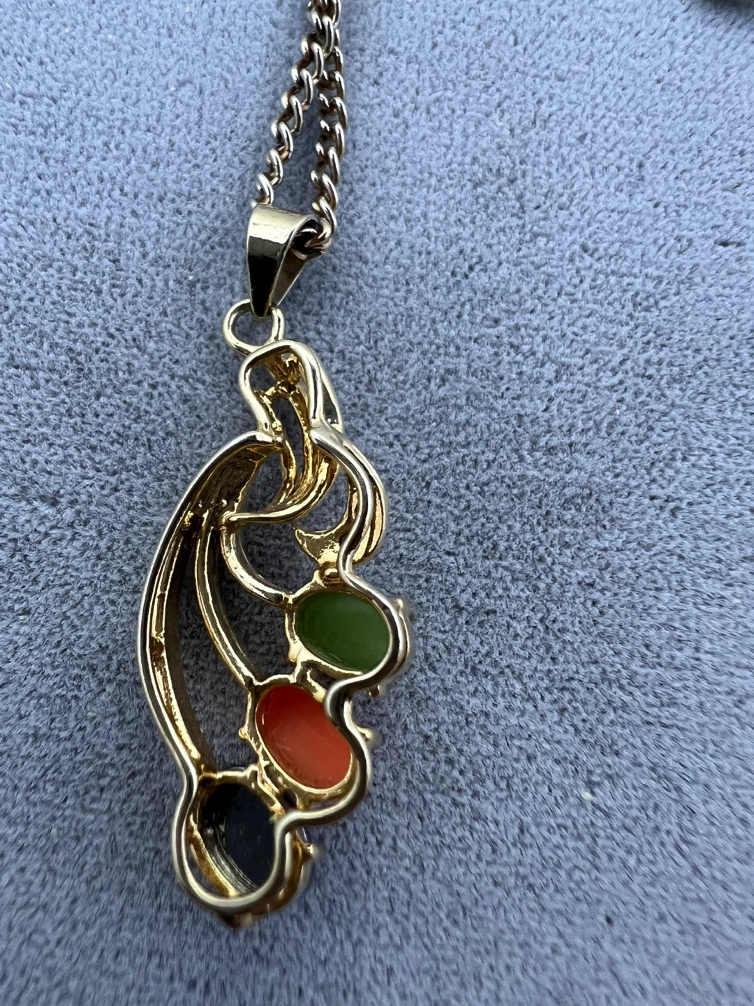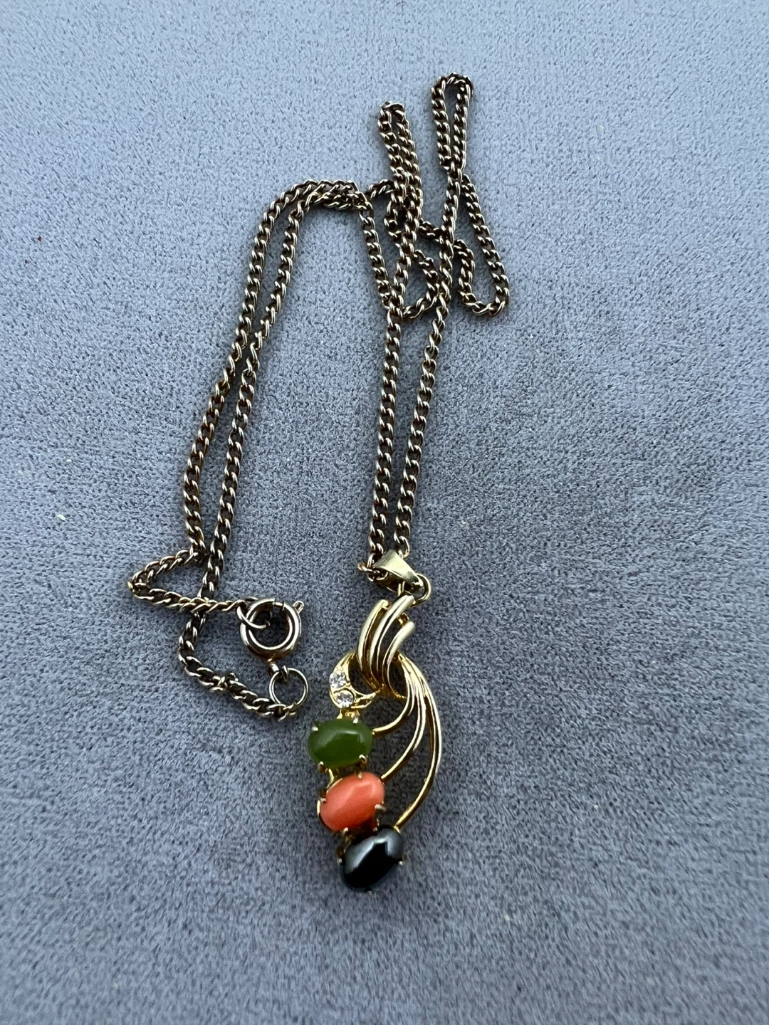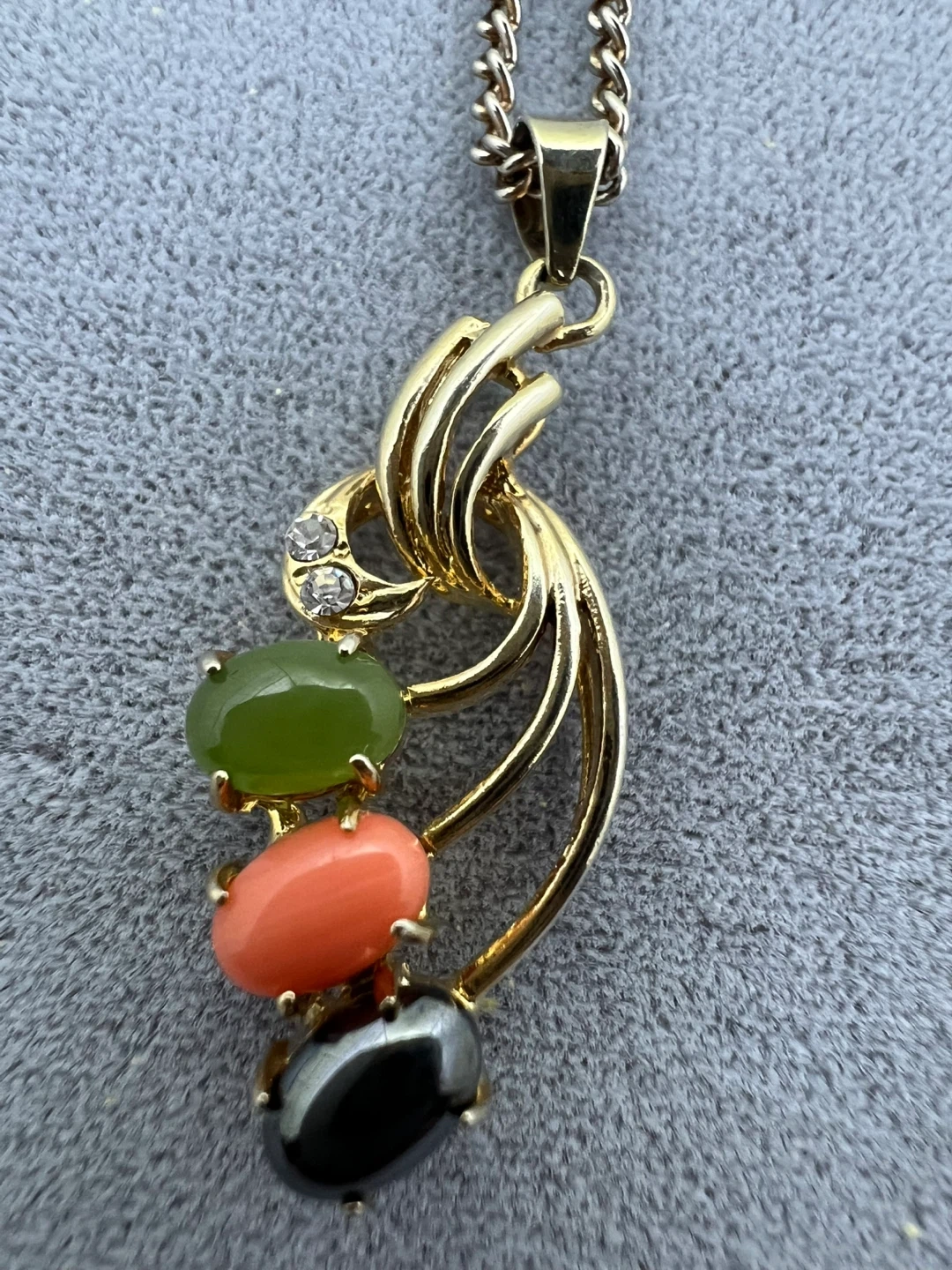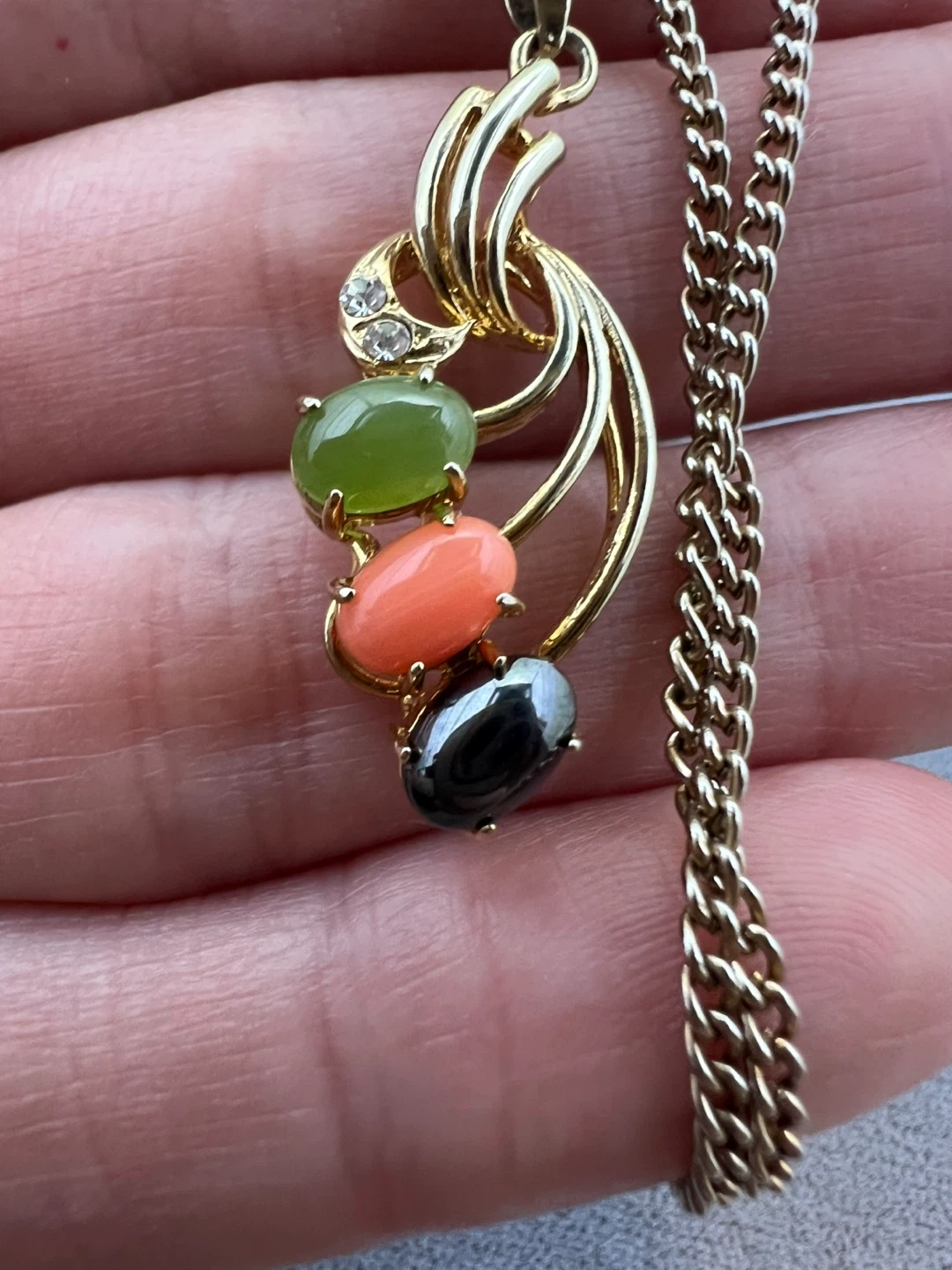 Pendant with 3 oval cabachon stones (green, peach and black) and clear stones accents (top of the pendant)