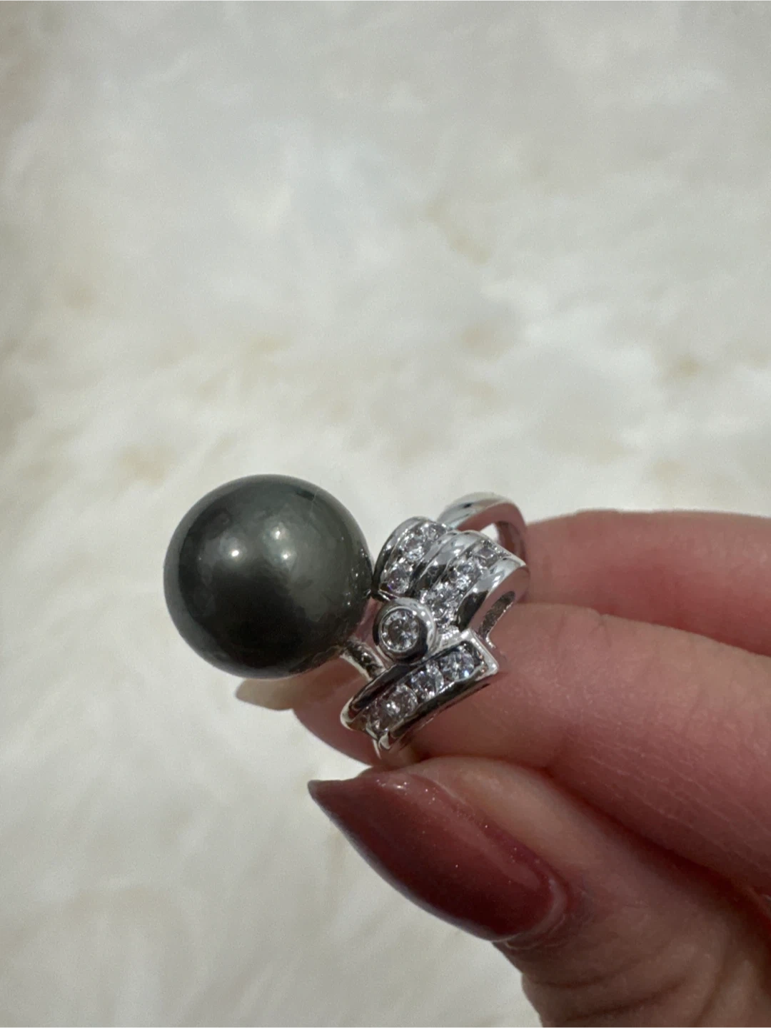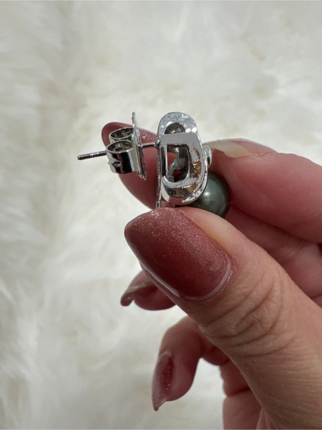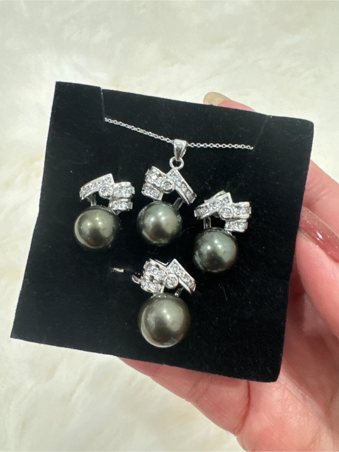 Beautifully Authentic South Sea pearl and diamond jewelry set. Includes a pendant necklace, a matching ring, and a pair of stud earrings. All pieces showcase lustrous dark pearls complemented by sparkling white stones. Comes in a presentation box with Certification of Authenticity.