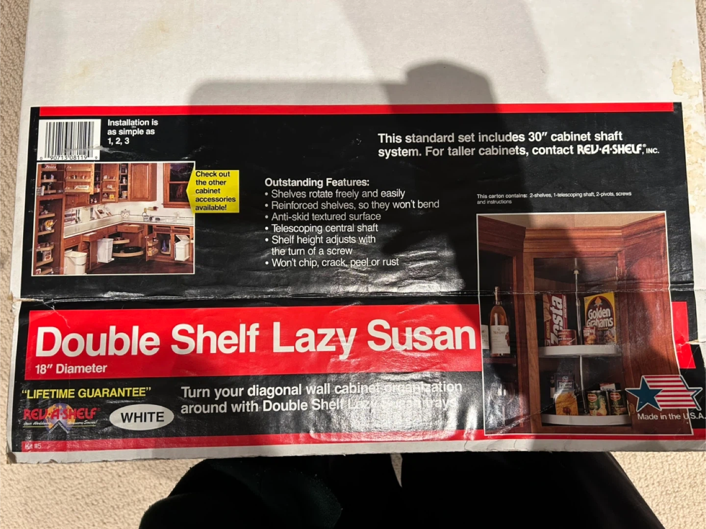Two shelves (18” diameter), one telescopic shaft, and screws/pivots for installation