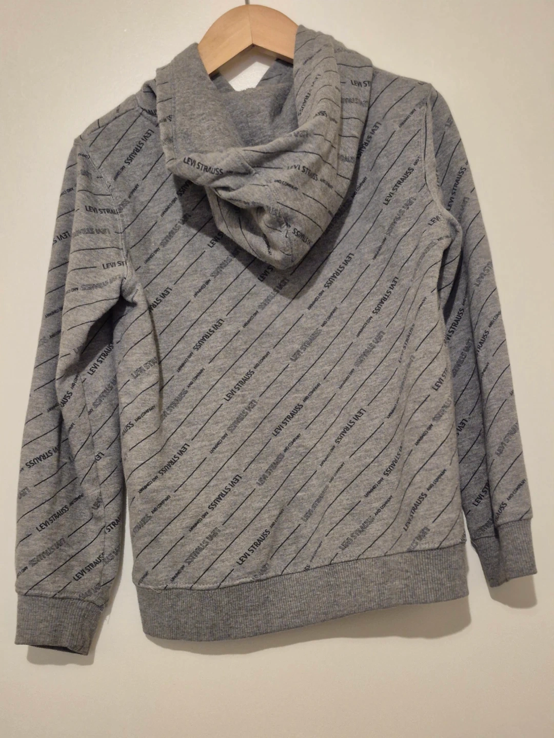 This is a grey Levi's hoodie with an all-over logo print. It features a kangaroo pocket and a hood. Made from a comfortable cotton blend.