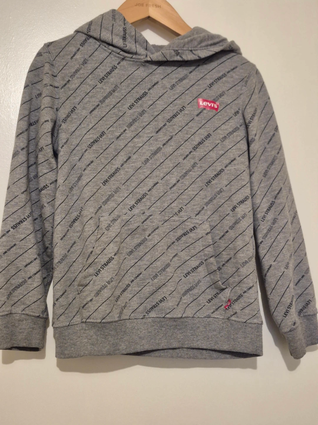 This is a grey Levi's hoodie with an all-over logo print. It features a kangaroo pocket and a hood. Made from a comfortable cotton blend.