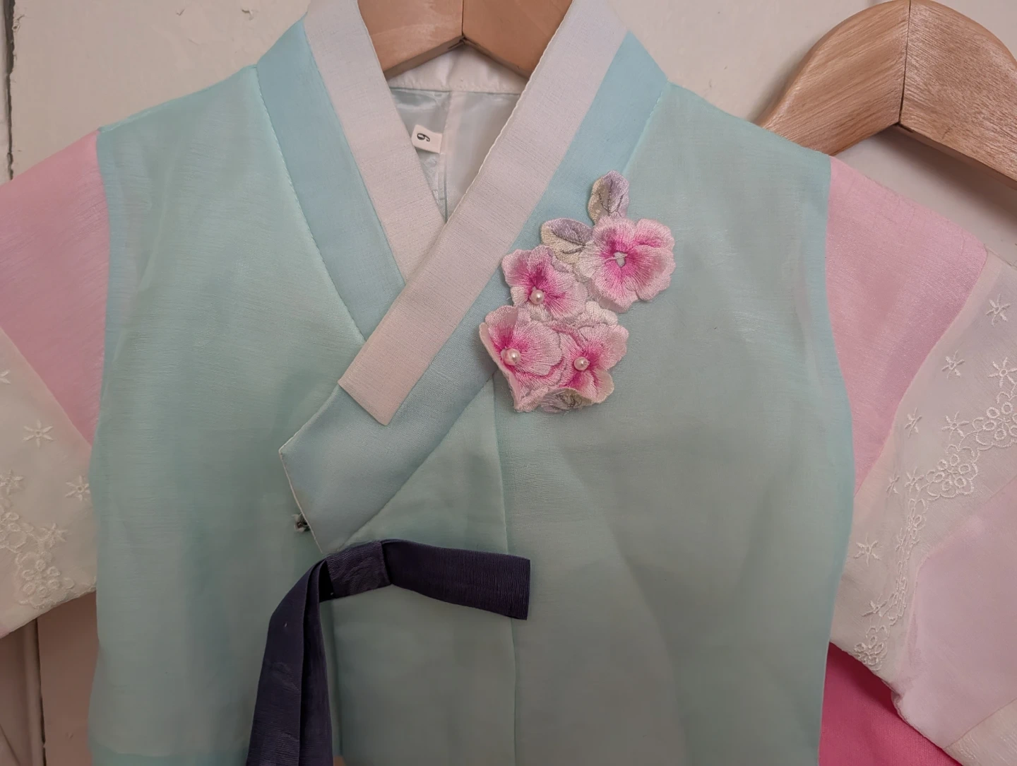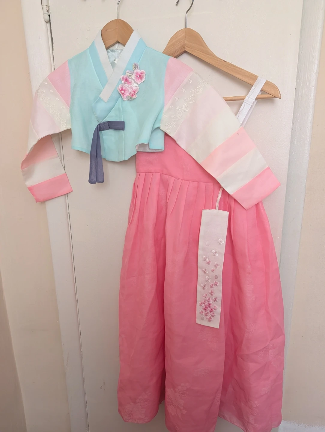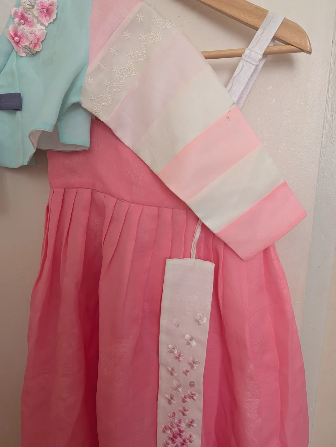 This is a beautiful pink and teal Hanbok dress for children. It features delicate floral embroidery on the bodice and a flowing pink skirt. Perfect for special occasions or cultural events!