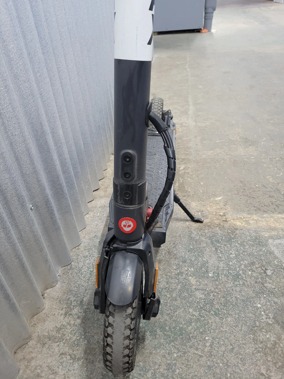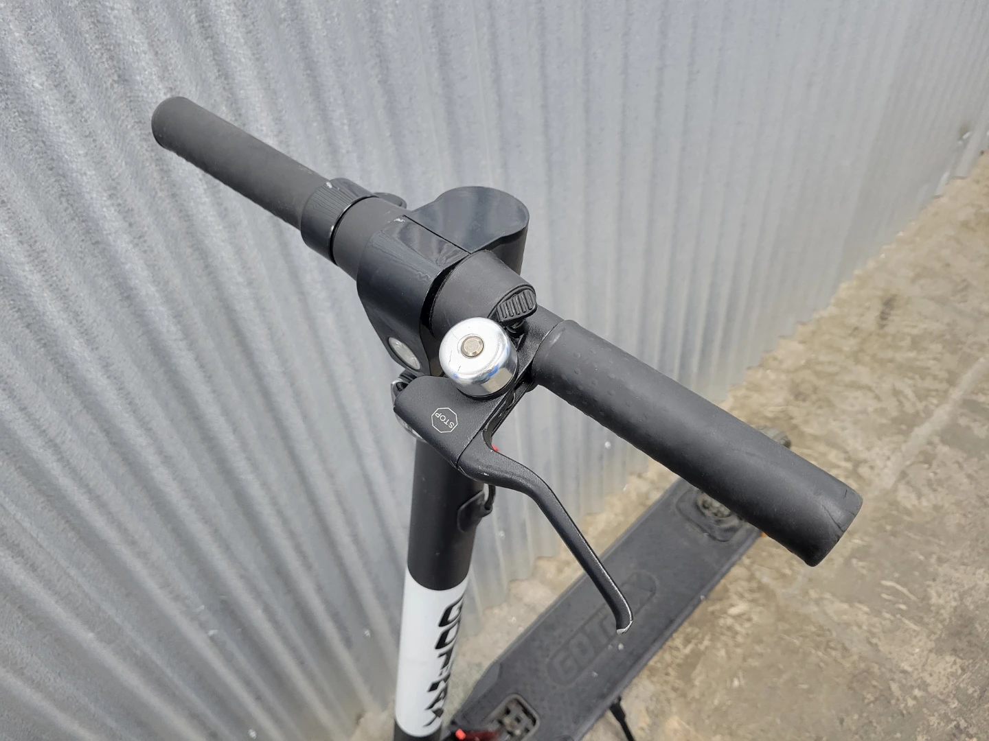 This is a GOTRAX electric scooter. It has rugged tires for varied terrain and a disc brake system for stopping power. The handlebars are adjustable and include a bell.