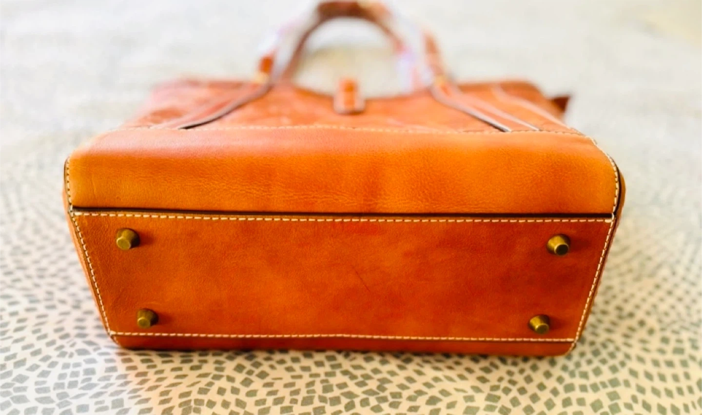 It's made from genuine leather and has a spacious interior with zippered pockets. Four metal studs protect the bottom.