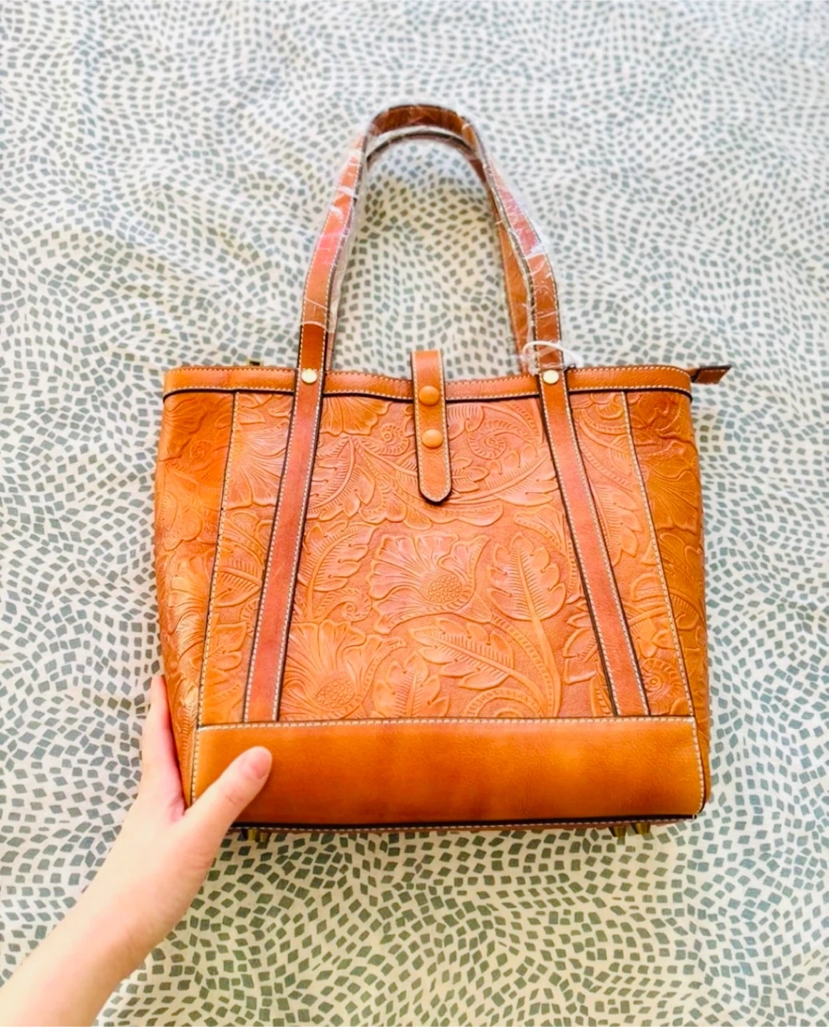 This stylish brown tote bag features a beautiful embossed floral pattern.