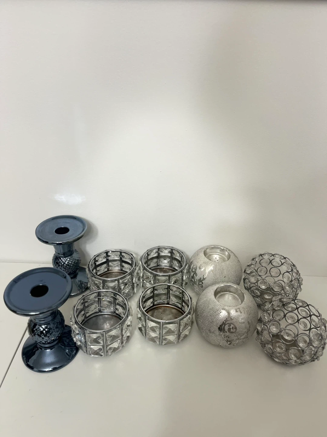 Includes two dark blue metallic candle holders and five decorative holders with clear jewels and silver accents. These holders are perfect for adding a touch of sparkle to any room or for special occasions. Various styles included!