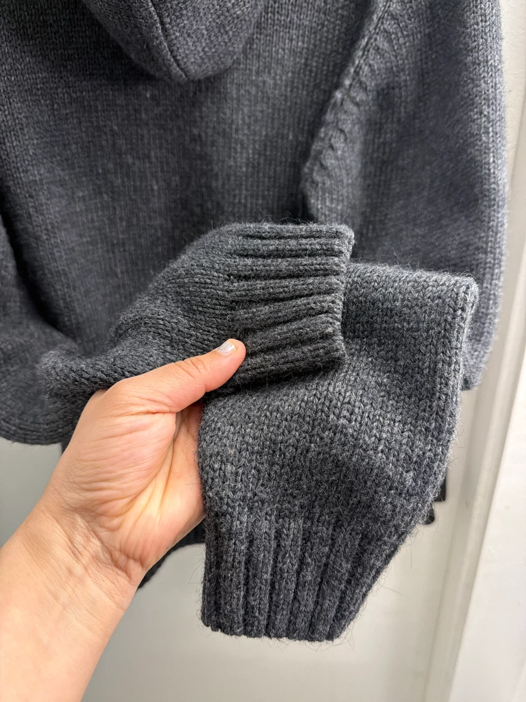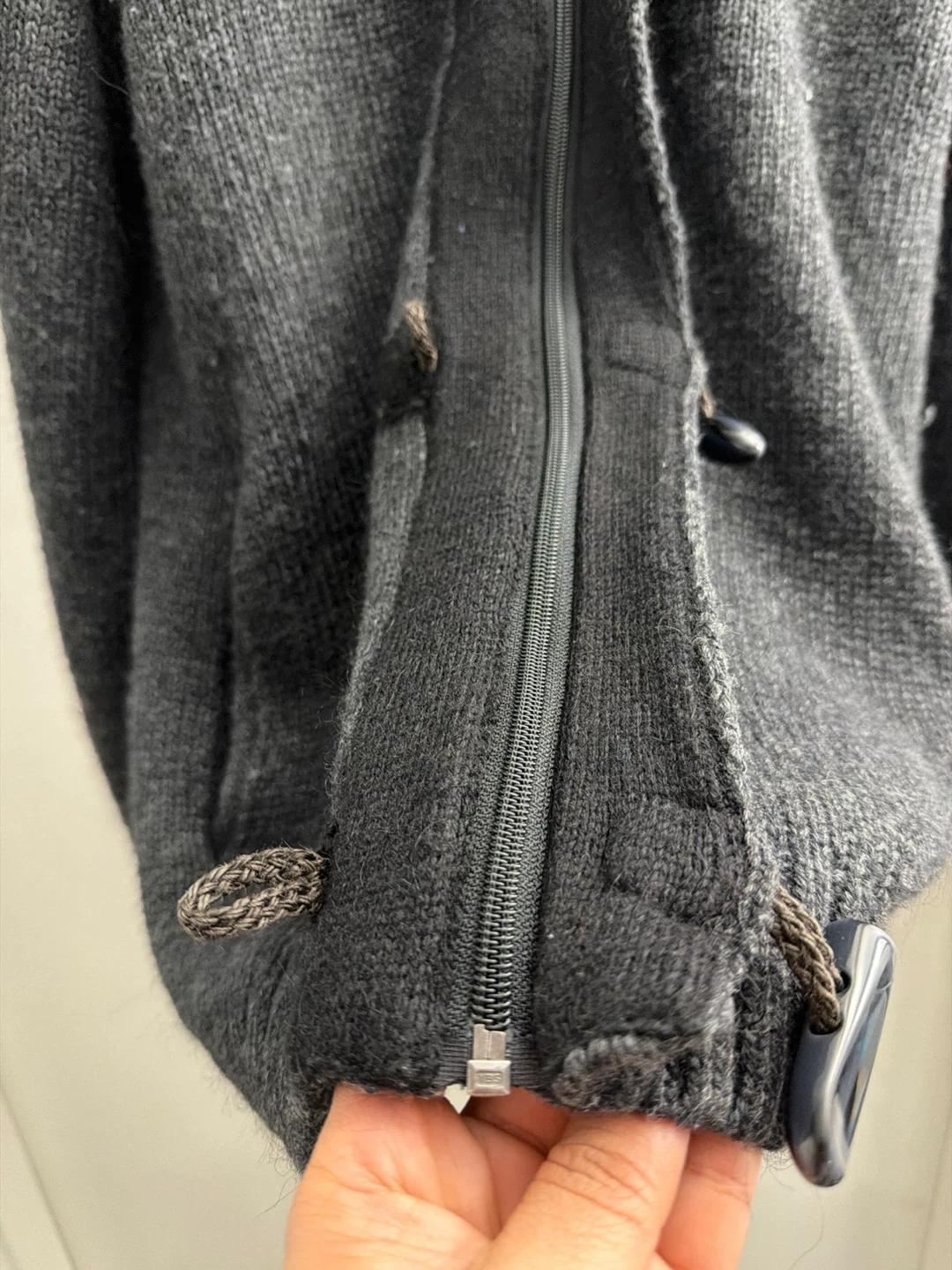 A cozy knit sweater hoodie from 7 Diamonds. Features duffle toggle closures and a full zip. Made with a soft, dark grey knit material. Perfect for layering on cooler days!