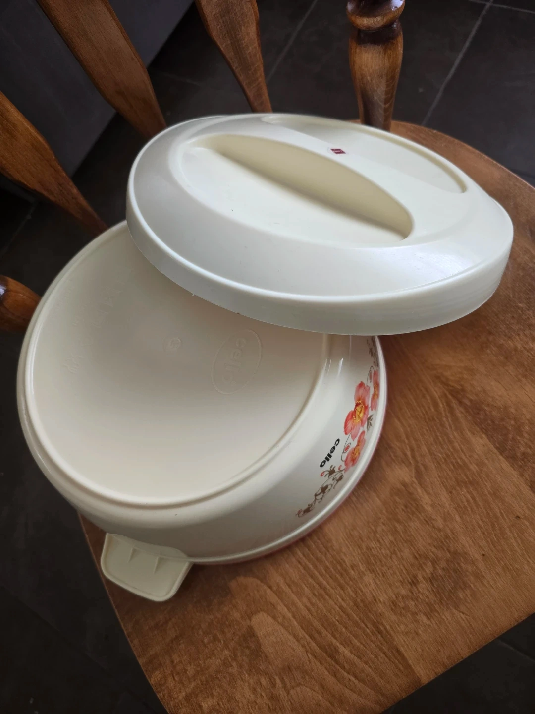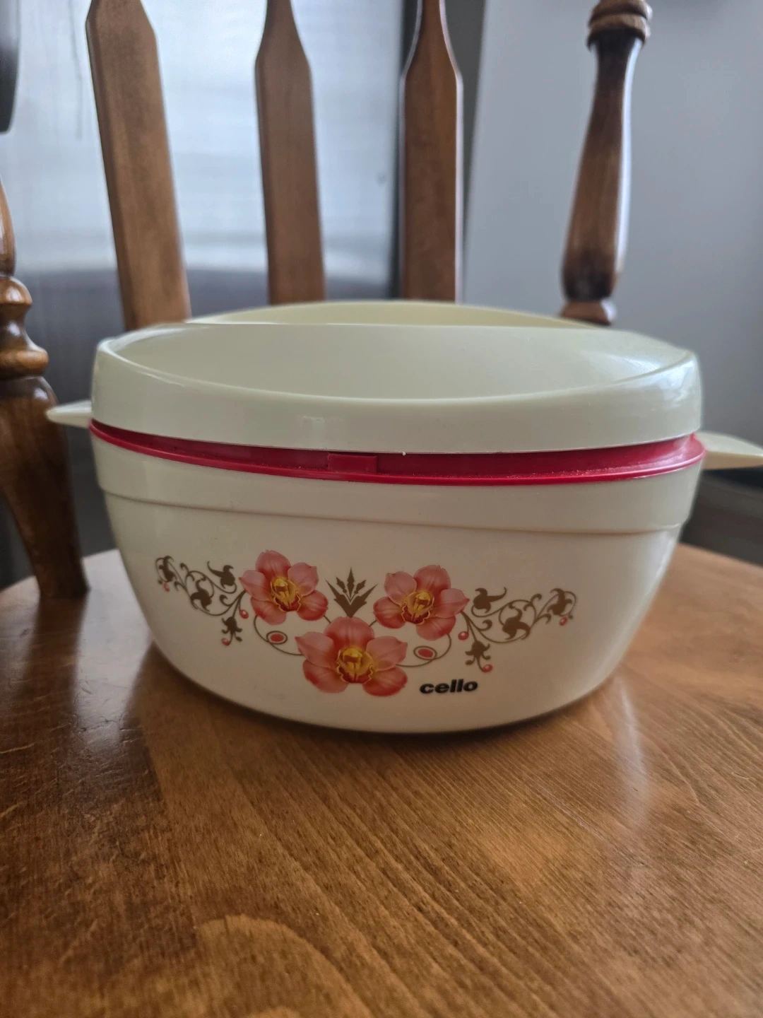 Keep your food warm with this Cello insulated casserole dish. It features a durable plastic exterior with a floral design and a stainless steel interior. The lid has a handle for easy carrying. Perfect for serving hot meals at gatherings or keeping leftovers fresh.