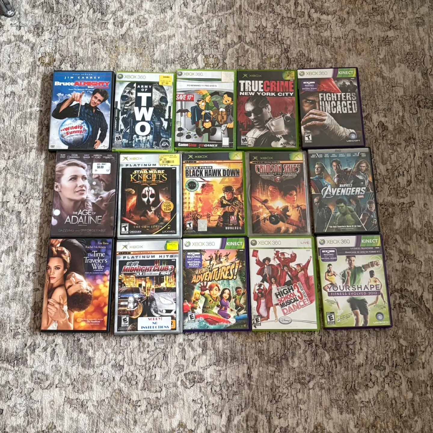 I’ve had these in storage I don’t use Xbox. I don’t need anymore they’re all working and in great condition. These games and other dvds like movies. All of them would be more than $300. Selling all together.