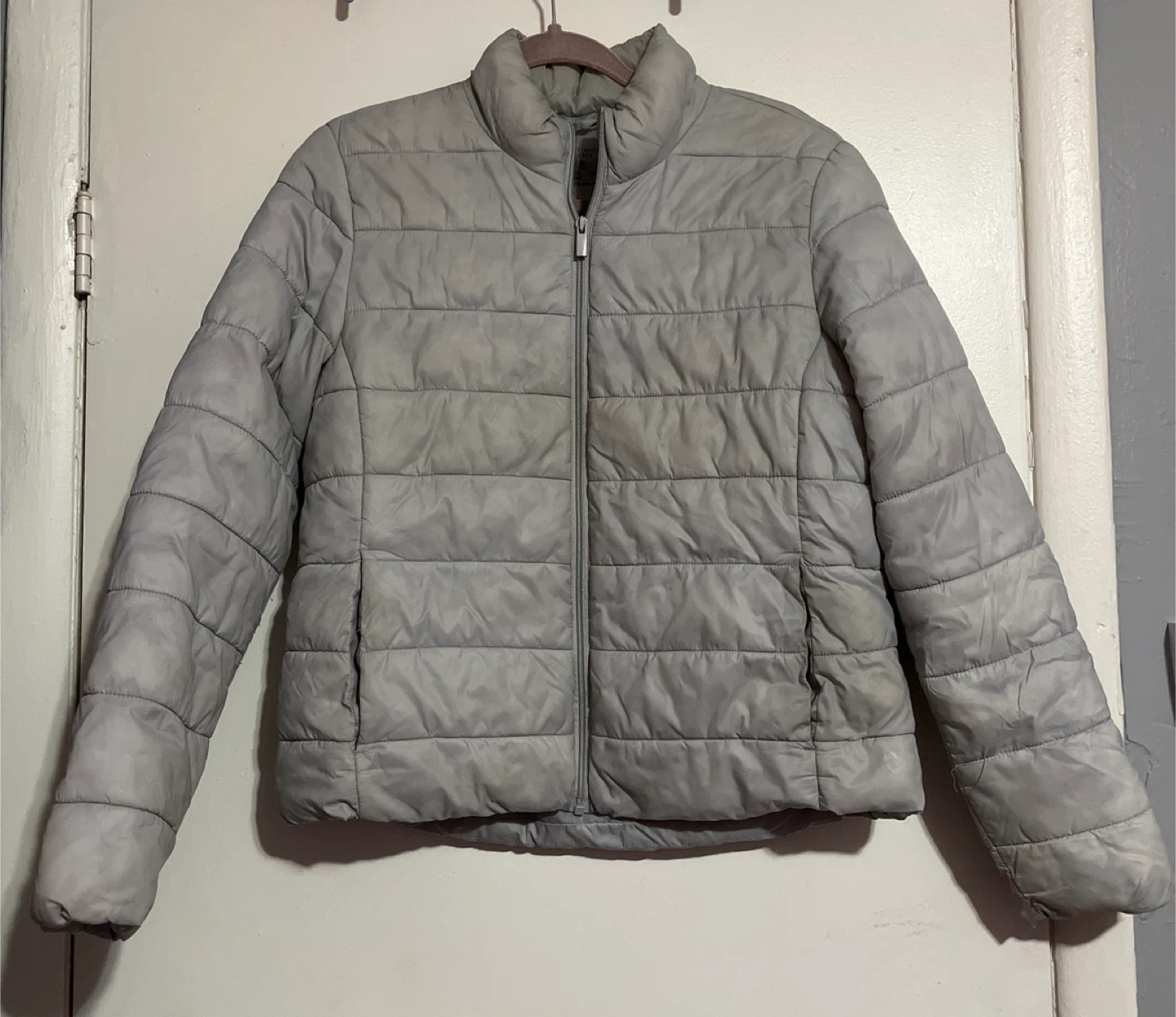 Light gray quilted puffer jacket from Primark Cares. Features a cozy padded high collar, full zip front, and lightweight warmth that’s perfect for everyday wear. Easy to layer and super versatile for fall and winter.
