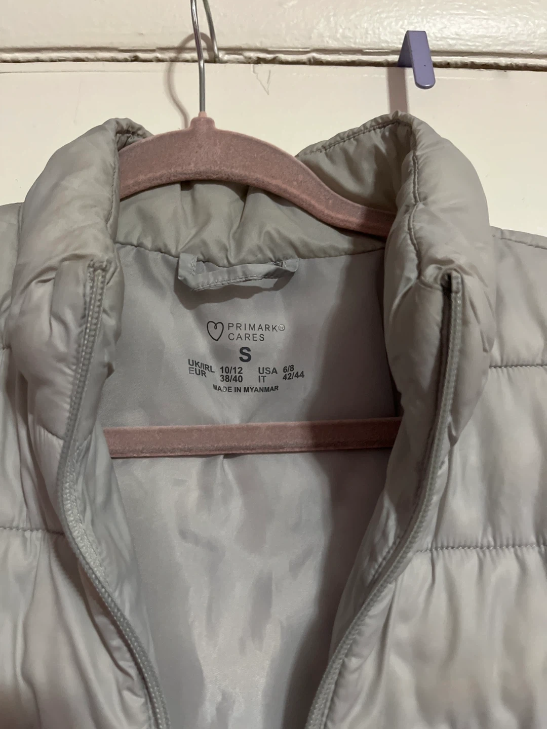 Light gray quilted puffer jacket from Primark Cares. Features a cozy padded high collar, full zip front, and lightweight warmth that’s perfect for everyday wear. Easy to layer and super versatile for fall and winter.