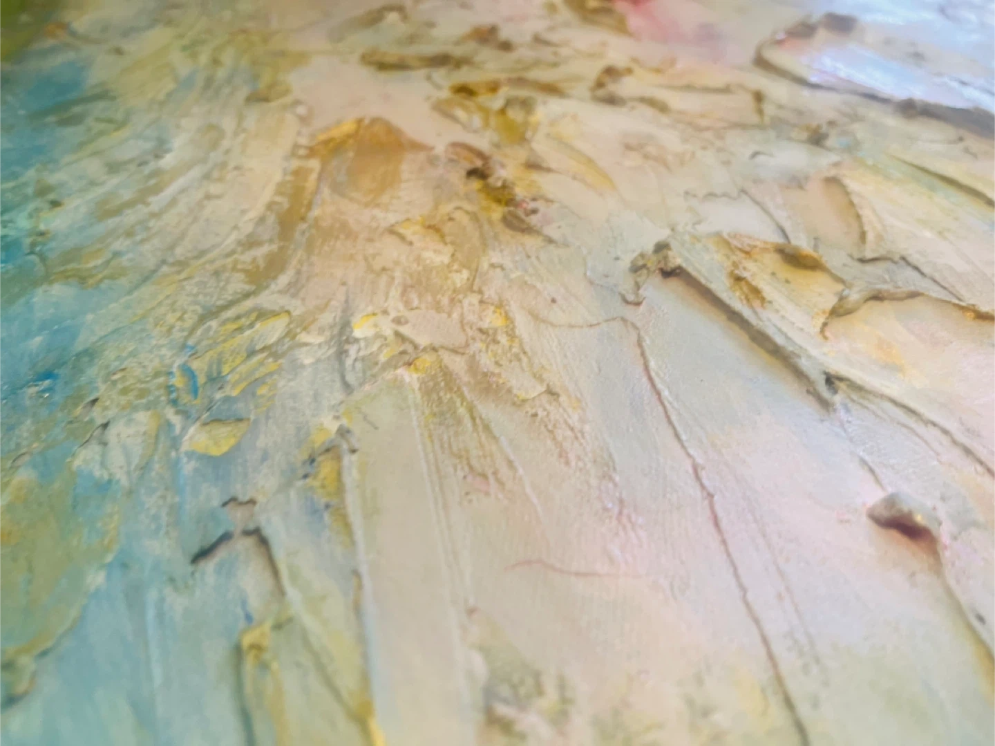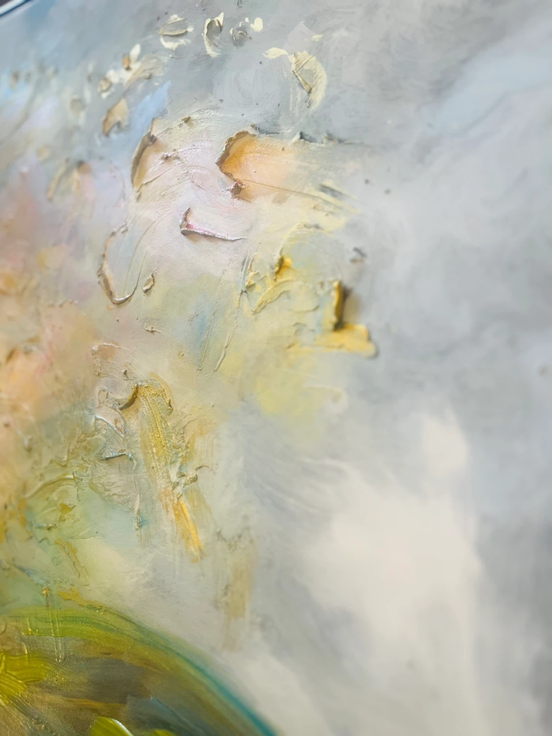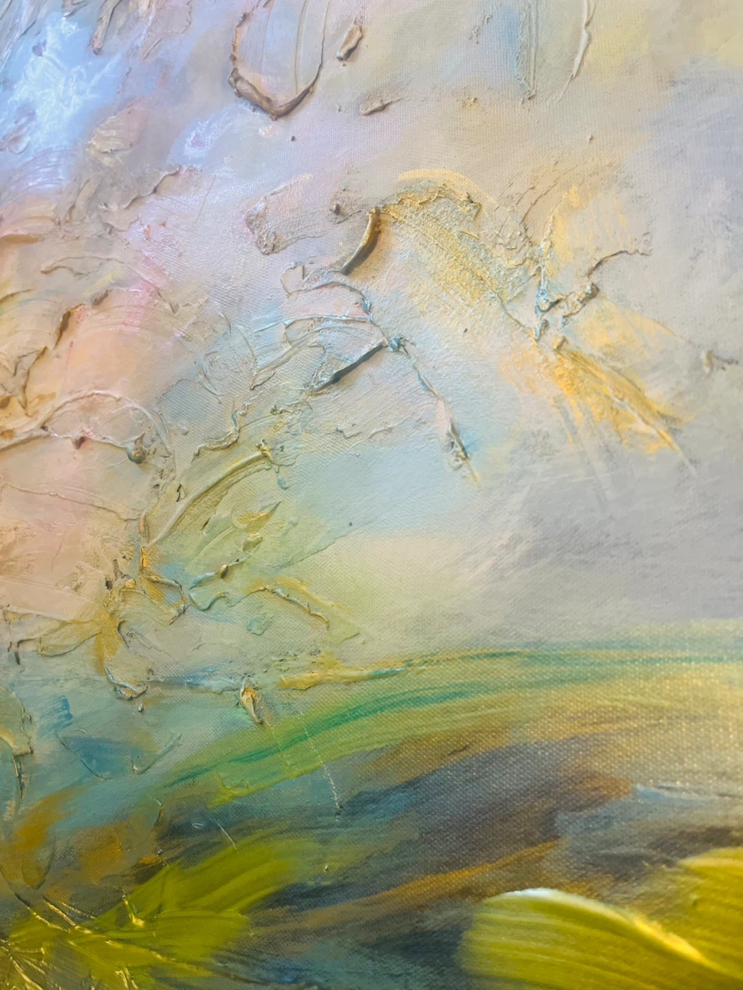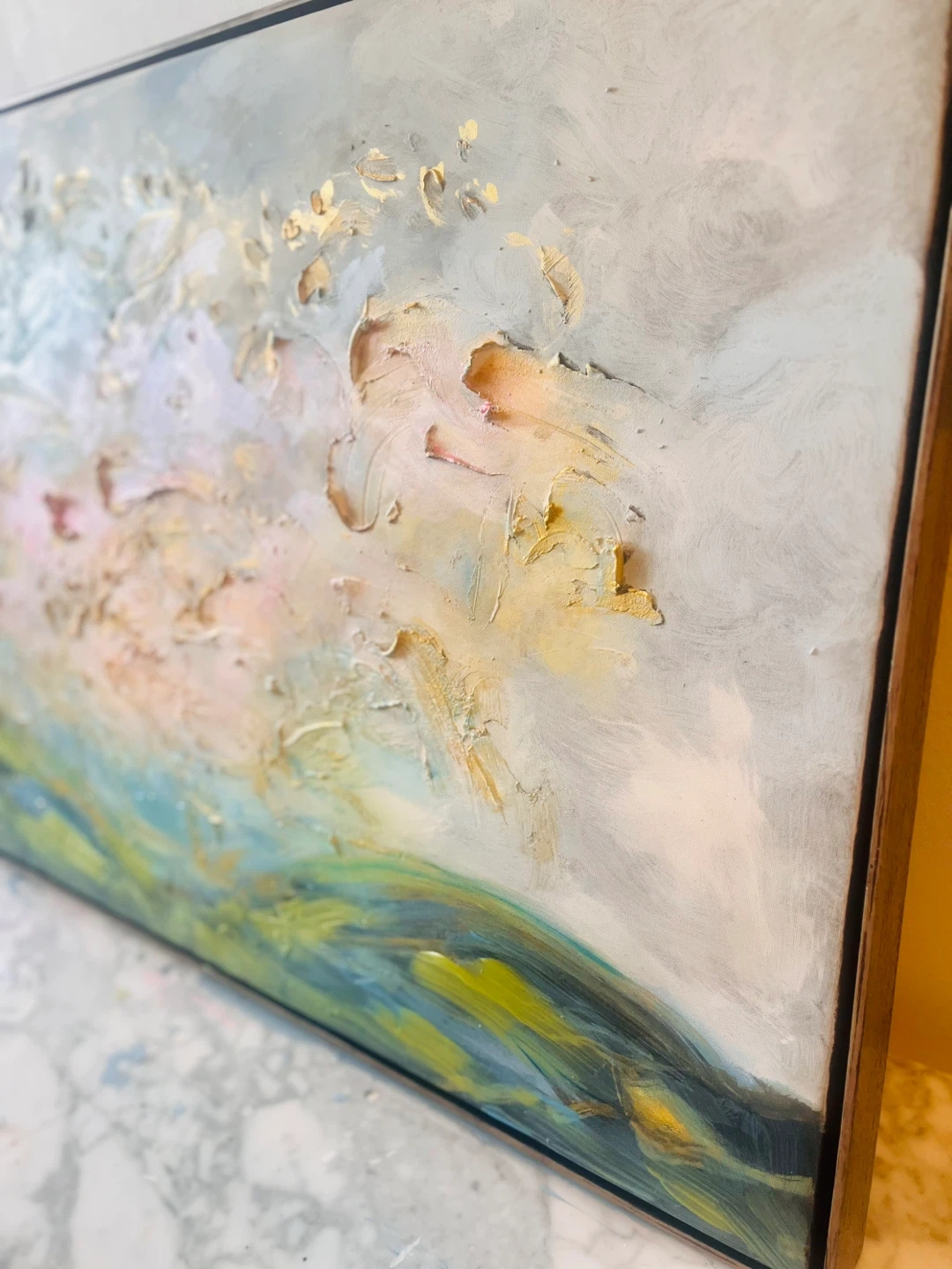 Textured painting with impasto technique. Features soft blues, greens, and warm yellows. It's an abstract landscape. Thick brushwork with gold patina in a modern floater frame. Last 2 photos taken with bright studios lights on and then no lights just sunlight from the left side window.