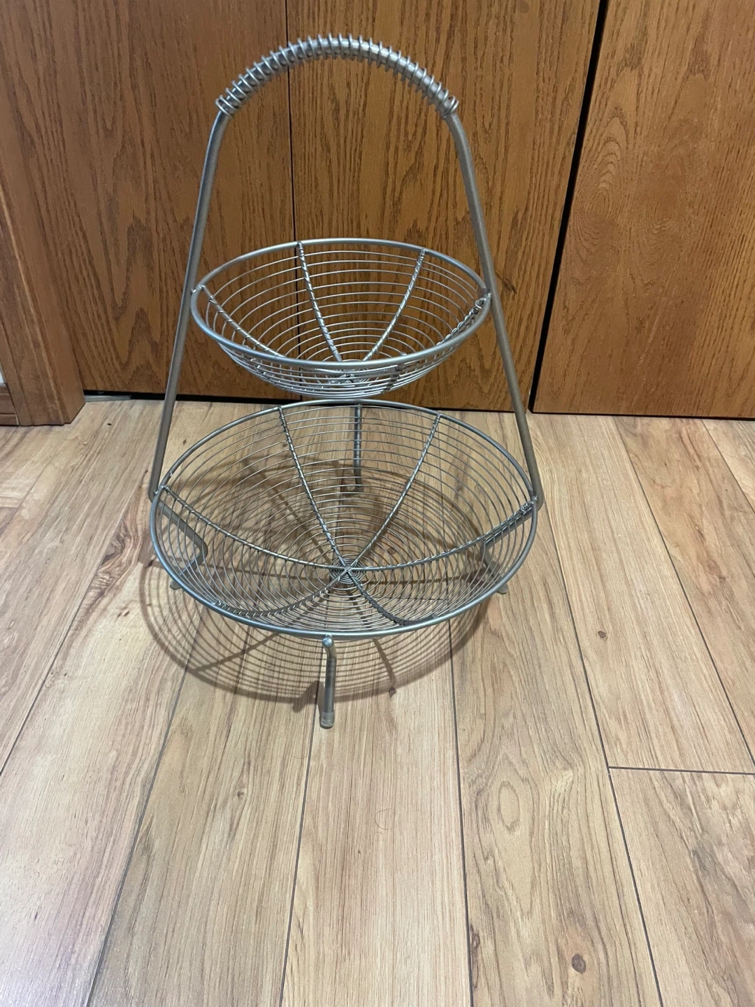 A two-tier wire basket with a handle. It's made of metal with a silver finish. This stand is great for holding fruits and vegetables in your kitchen cash only please no e-transfers thank you