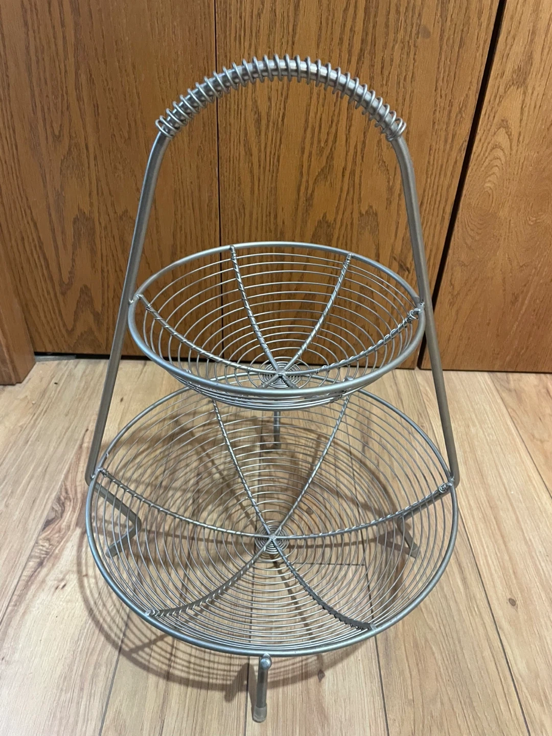A two-tier wire basket with a handle. It's made of metal with a silver finish. This stand is great for holding fruits and vegetables in your kitchen cash only please no e-transfers thank you