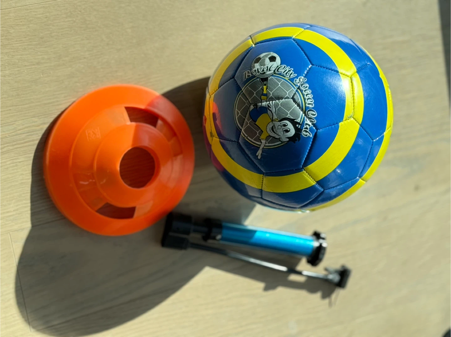 Selling a Royal City Soccer Club ball, 4 orange cones and blue air pump.
