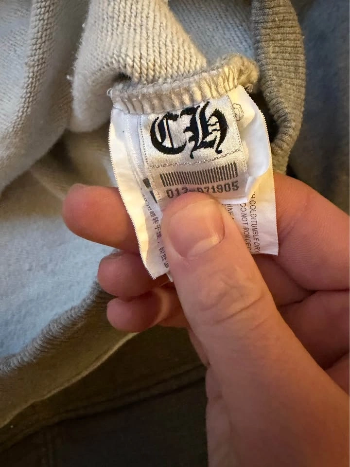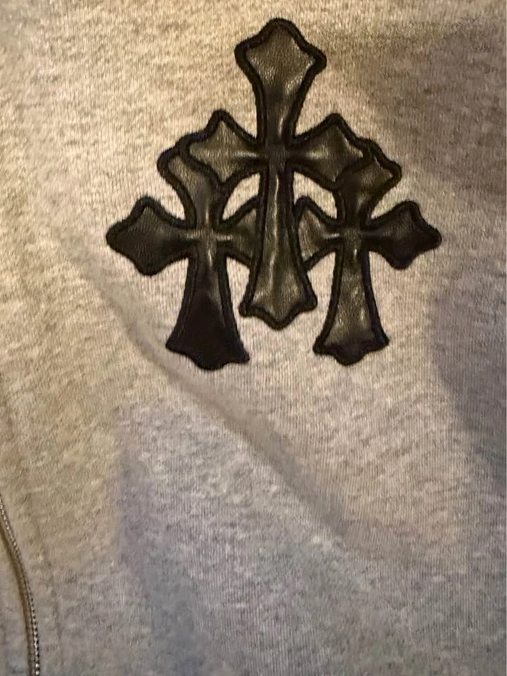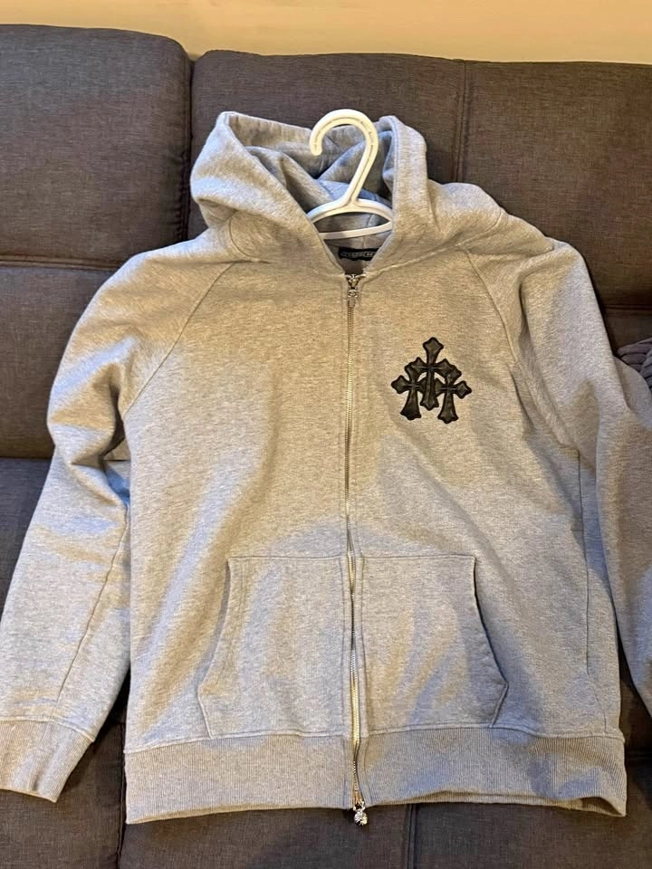 Comfy Chrome Hearts grey zip-up hoodie with a cool black triple cross patch on the front. Features a silver-toned zipper with a decorative pull and front pockets. Super soft and great for layering!