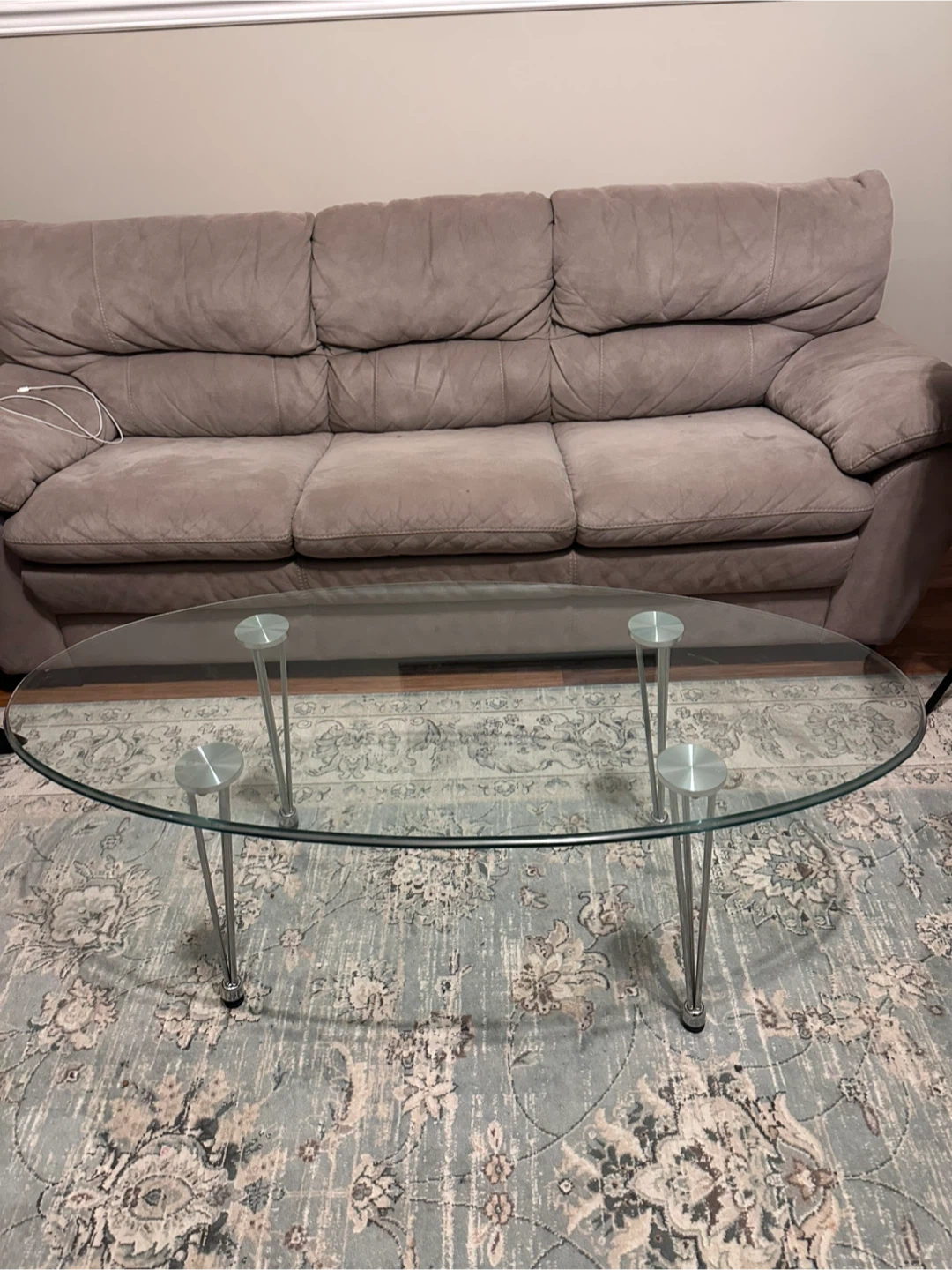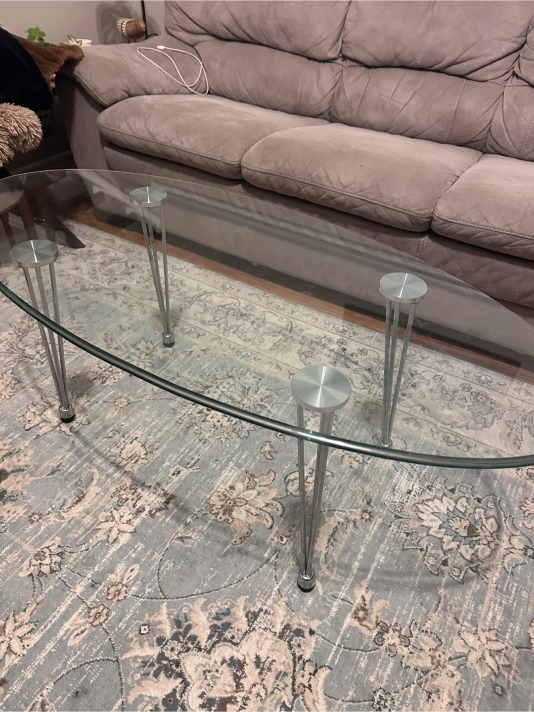 Oval glass coffee table with four silver metal legs. It has a sleek, modern design that fits well in a living room. Clear glass top. 55x 120 x 45y
