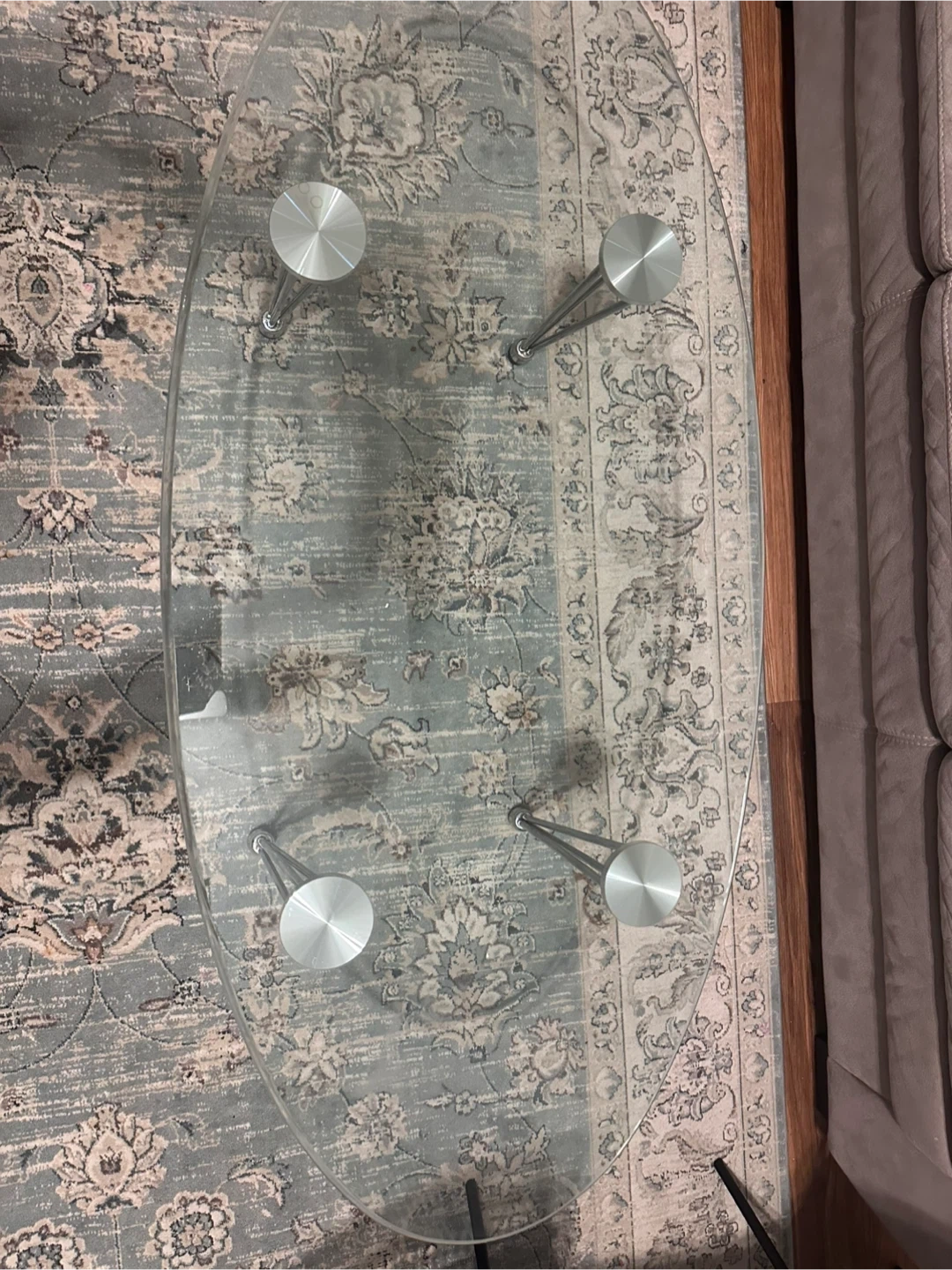 Oval glass coffee table with four silver metal legs. It has a sleek, modern design that fits well in a living room. Clear glass top. 55x 120 x 45y