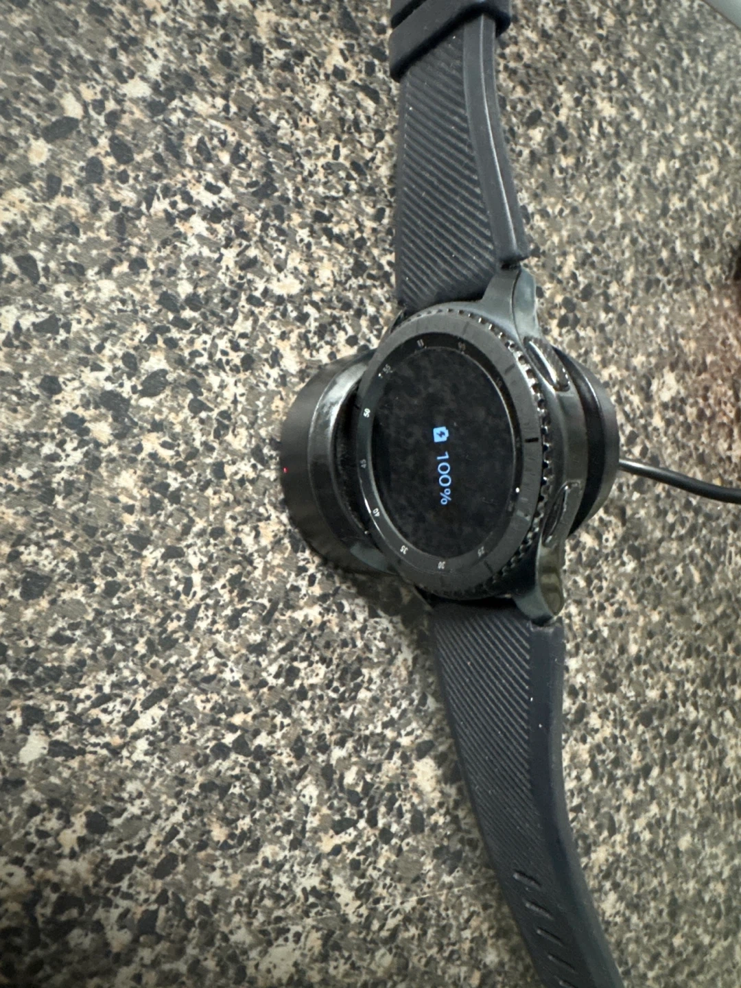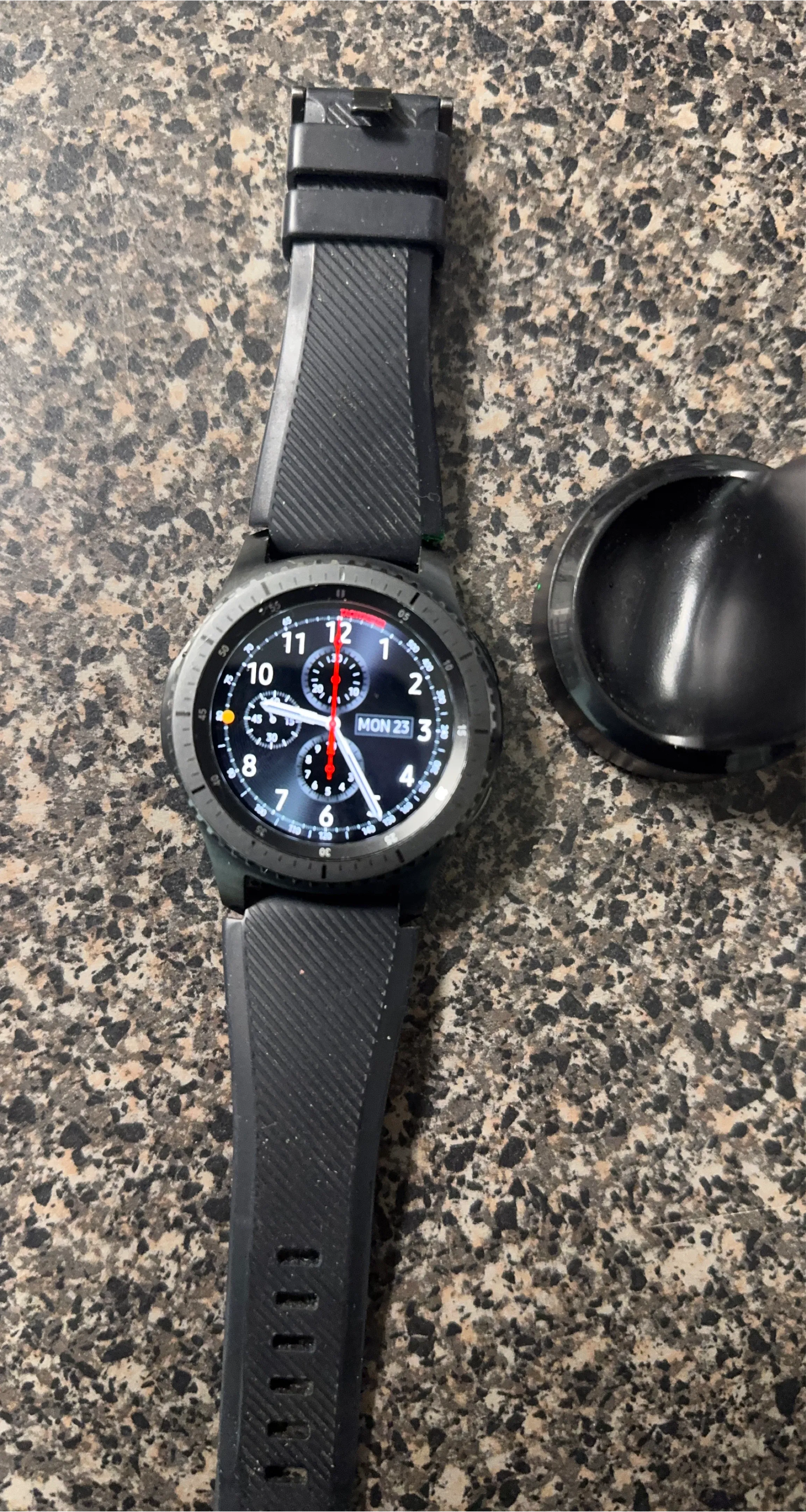 This is a Samsung Gear S3 Frontier smartwatch in black. It's a great device for tracking fitness and staying connected. It comes with its charging cradle.