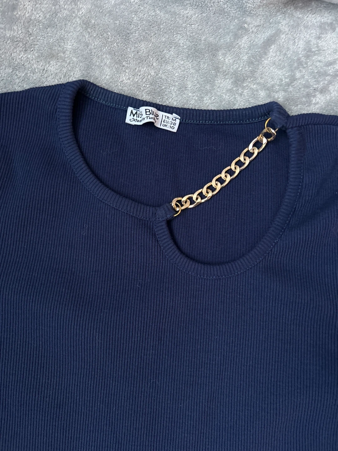 Navy Ribbed Long Sleeve Top with Gold Chain Detail - Medium