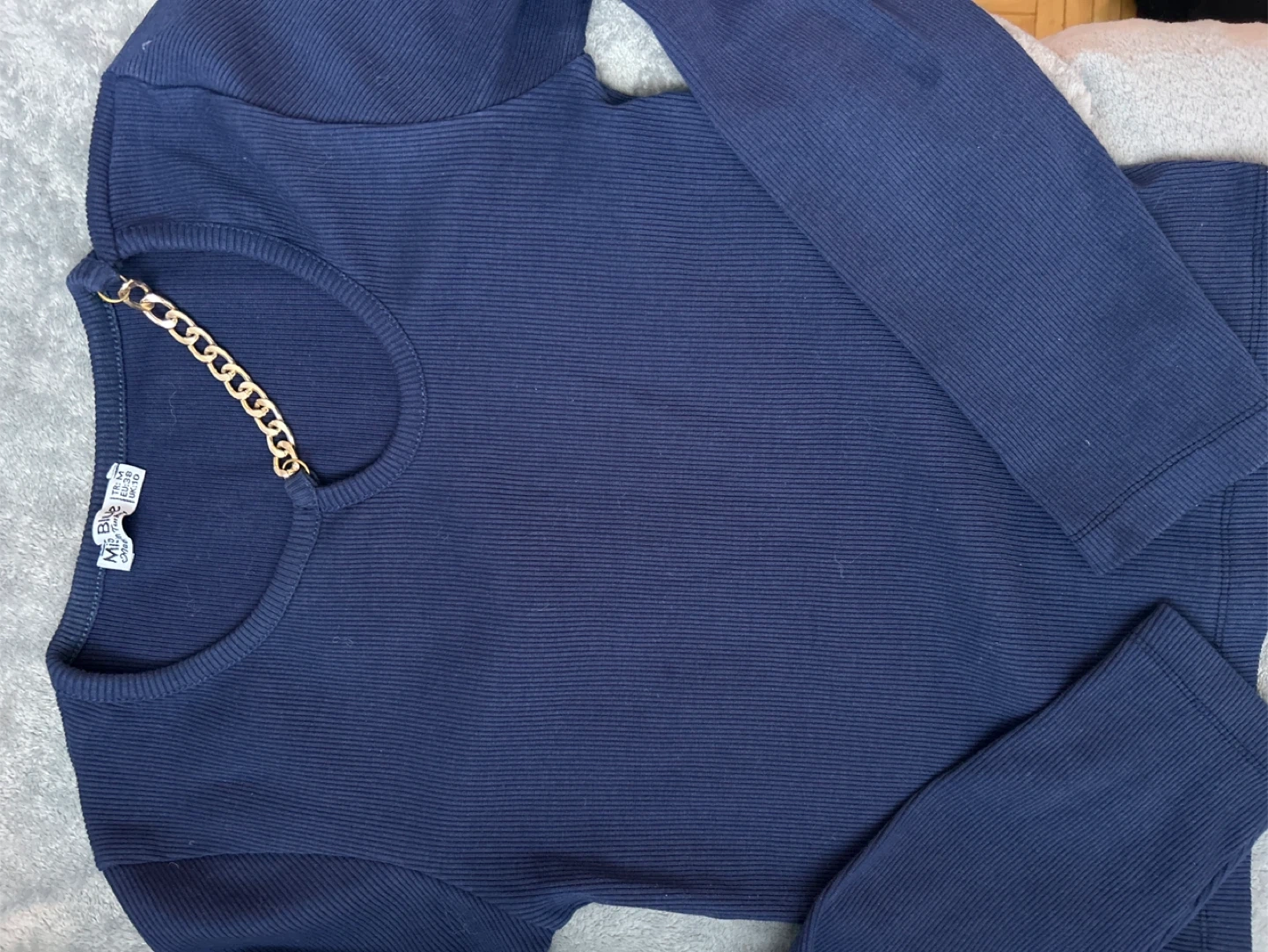This Mis Blue long sleeve top is a size medium and comes in a deep navy colour. It features a ribbed texture and a stylish gold chain detail at the neckline. Perfect for adding a touch of flair to your outfit! Very good quality after washing