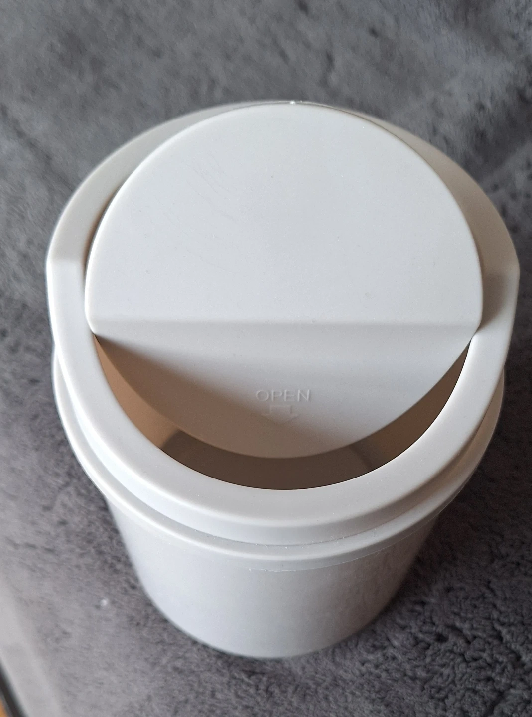 This is a handy white mini desk bin with a flip-top lid. It's perfect for keeping your workspace tidy by holding small scraps. The bin is made of plastic.