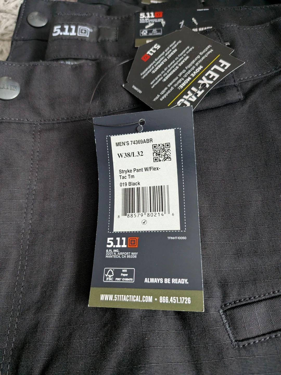 These are 5.11 Stryke pants in black. They're size W 38/L 32 and made with Flex-Tac technology. Designed for tactical use, they offer enhanced durability and flexibility.