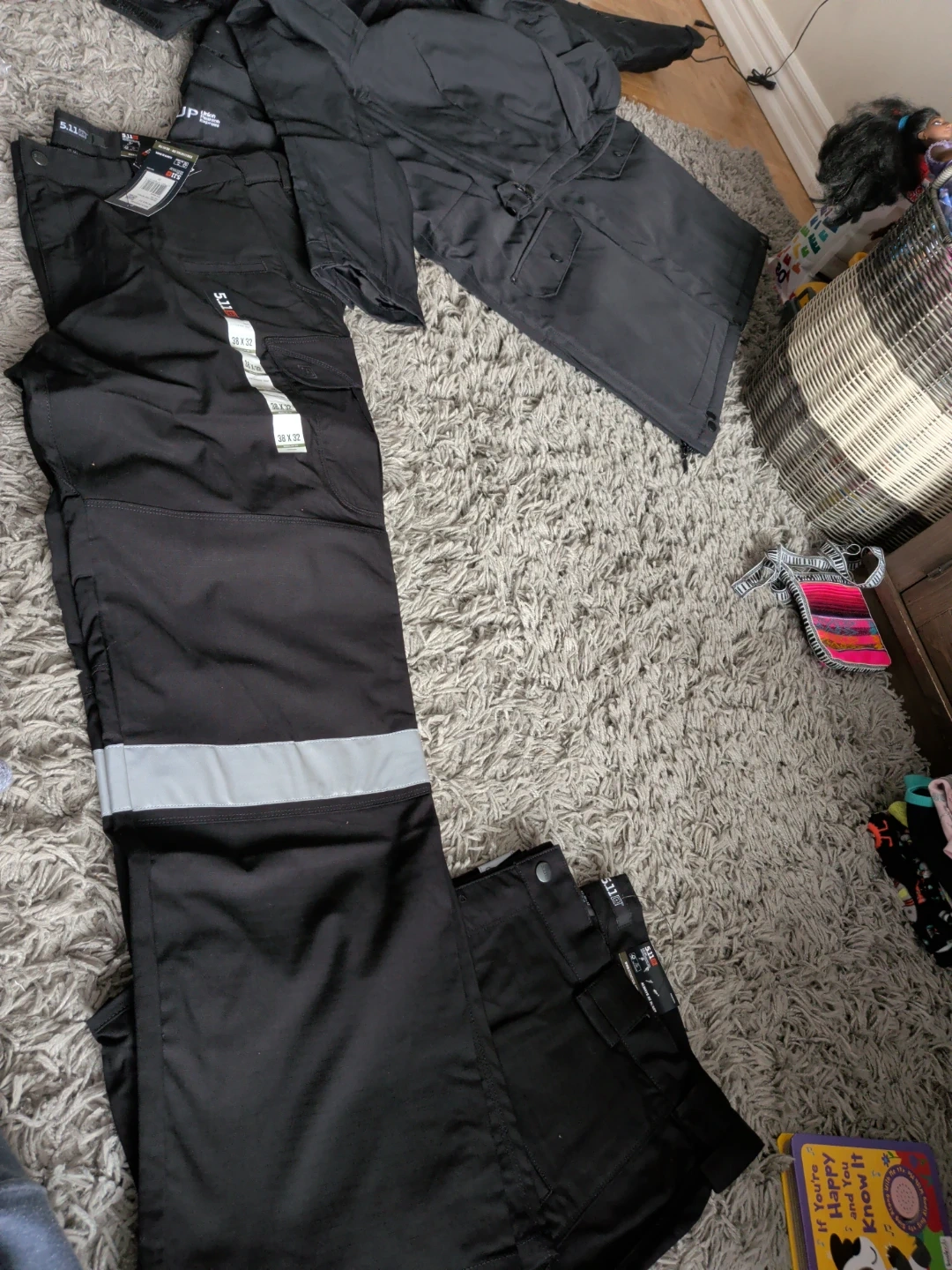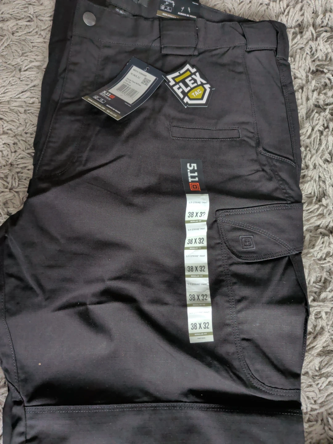 These are 5.11 Stryke pants in black. They're size W 38/L 32 and made with Flex-Tac technology. Designed for tactical use, they offer enhanced durability and flexibility.