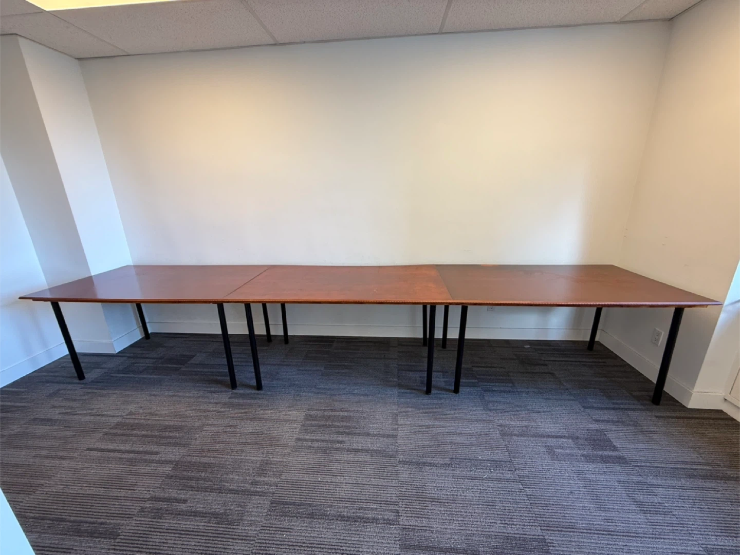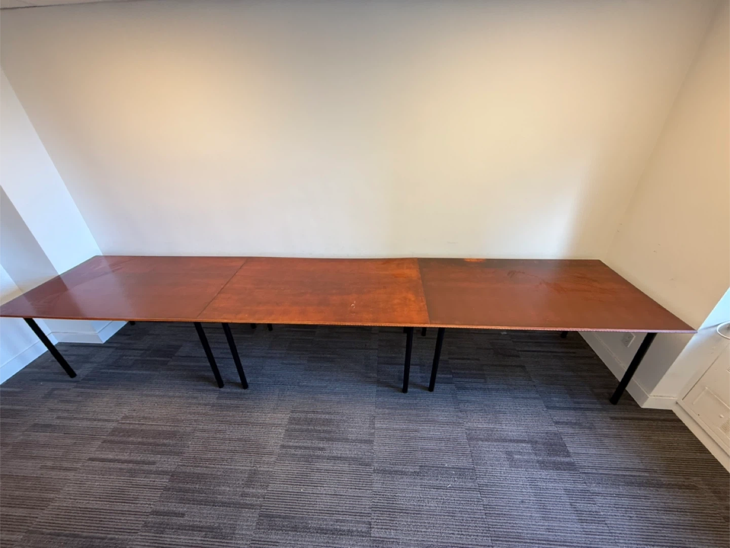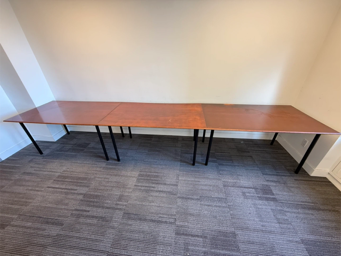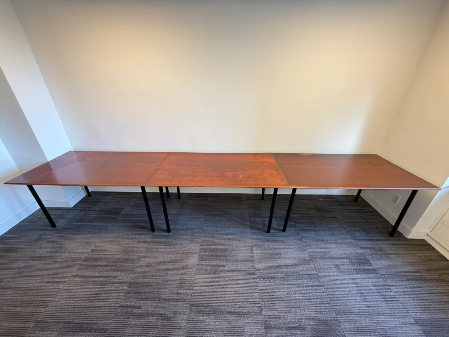 Ready for transport. This is a convertible from 3 nice desks into a long conference/office table with a wooden top and black metal legs. It's made up of multiple sections that join together to form a lengthy surface. It's ideal for meeting rooms or large workspaces. The surface is a warm wood tone with a smooth finish.