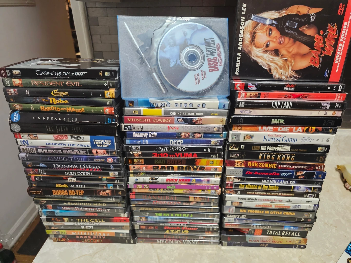 This is a large collection of DVDs featuring a variety of movies. Titles include Casino Royale 007, Resident Evil, Chinatown, Forrest Gump, and many more. Most are standard DVD format. This collection is for movie enthusiasts looking to expand their library.