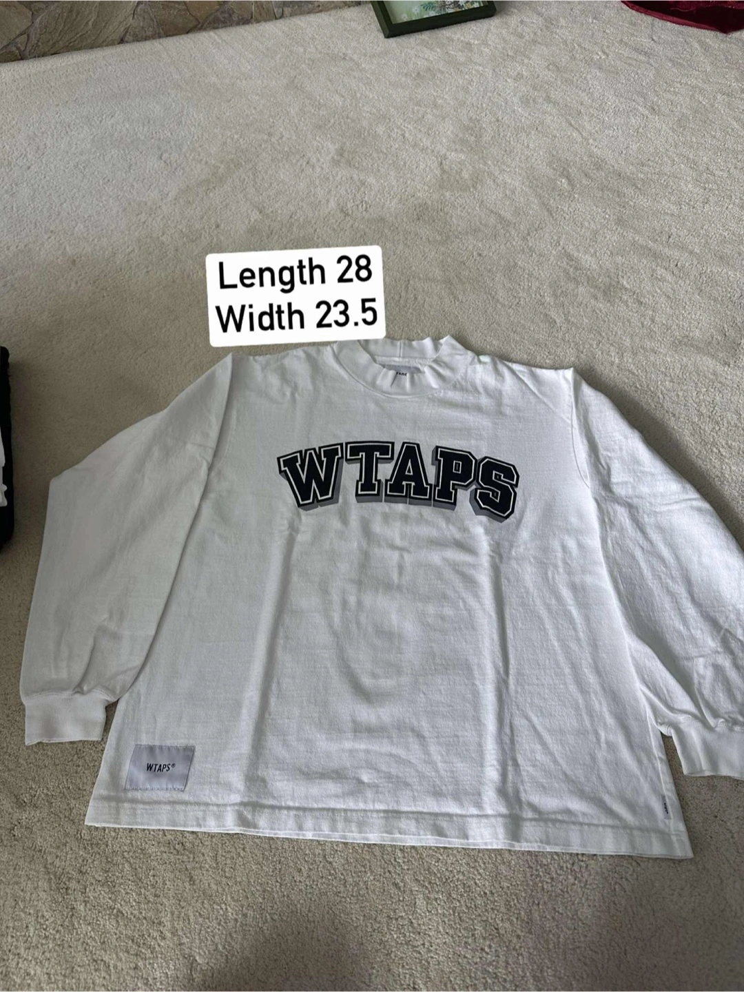 Selling a WTAPS long sleeve shirt in white. The shirt's length is 28 inches and the width is 23.5 inches