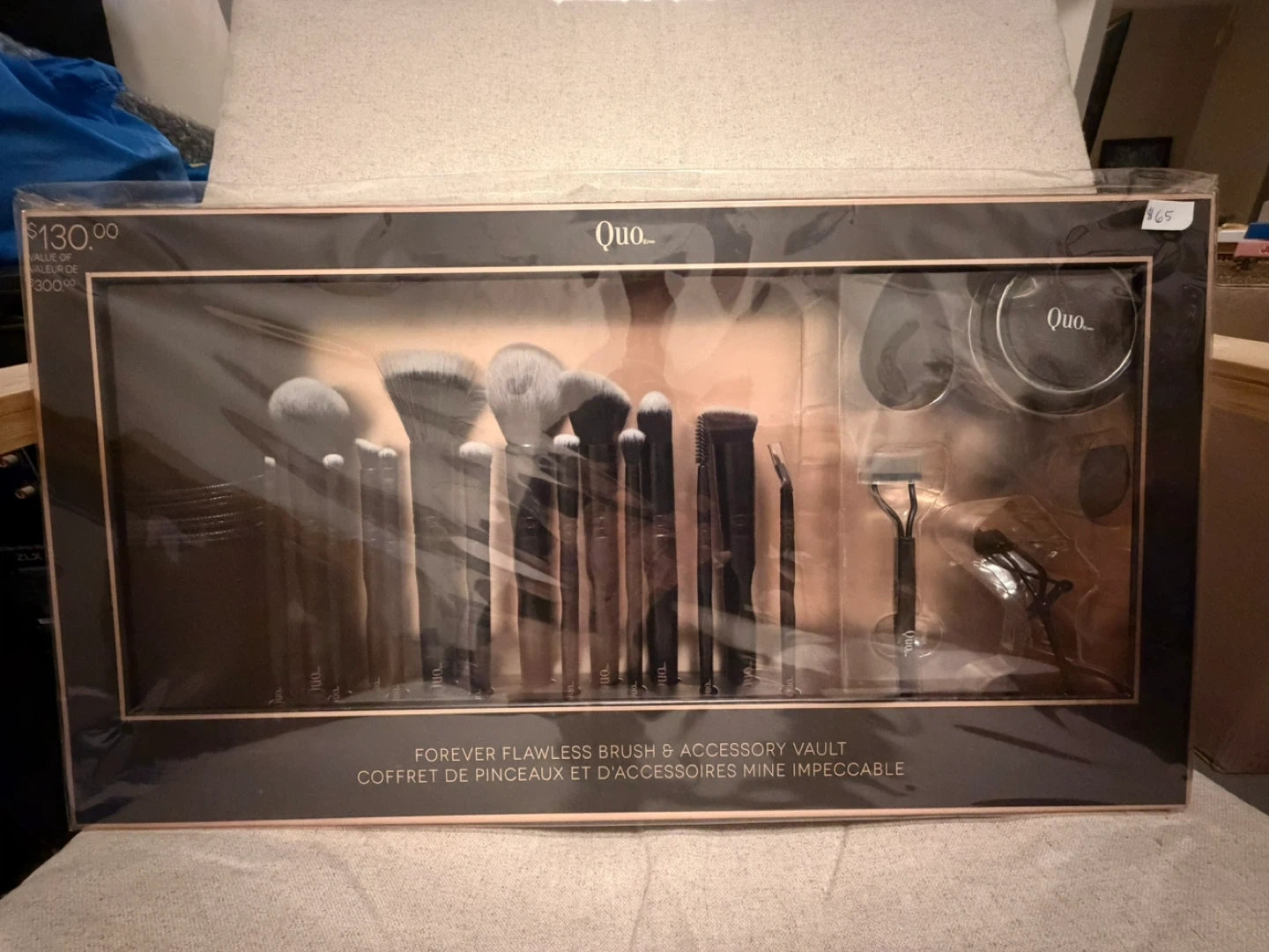 This is a Quo brush and accessory vault. It includes multiple makeup brushes and an eyelash curler. This set is perfect for makeup enthusiasts!