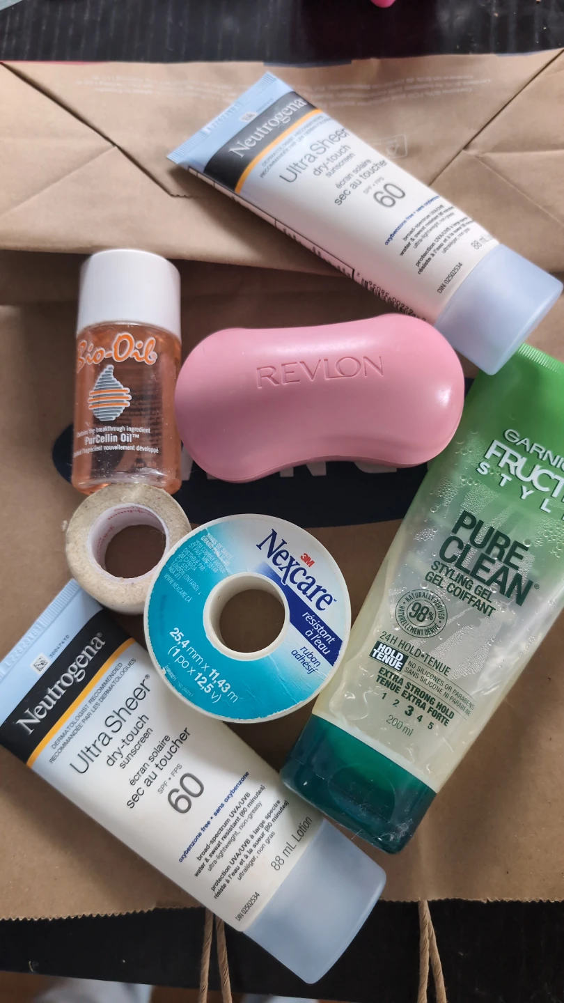 This bundle includes two tubes of EXPIRED Neutrogena Ultra Sheer Dry-Touch Sunscreen SPF 60 (88 mL each). It also features Garnier Fructis Style Pure Clean Styling Gel (200 mL) for extra strong hold. A Revlon foot file and Bio-Oil PurCellin Oil are also included, along with Nexcare waterproof tape.