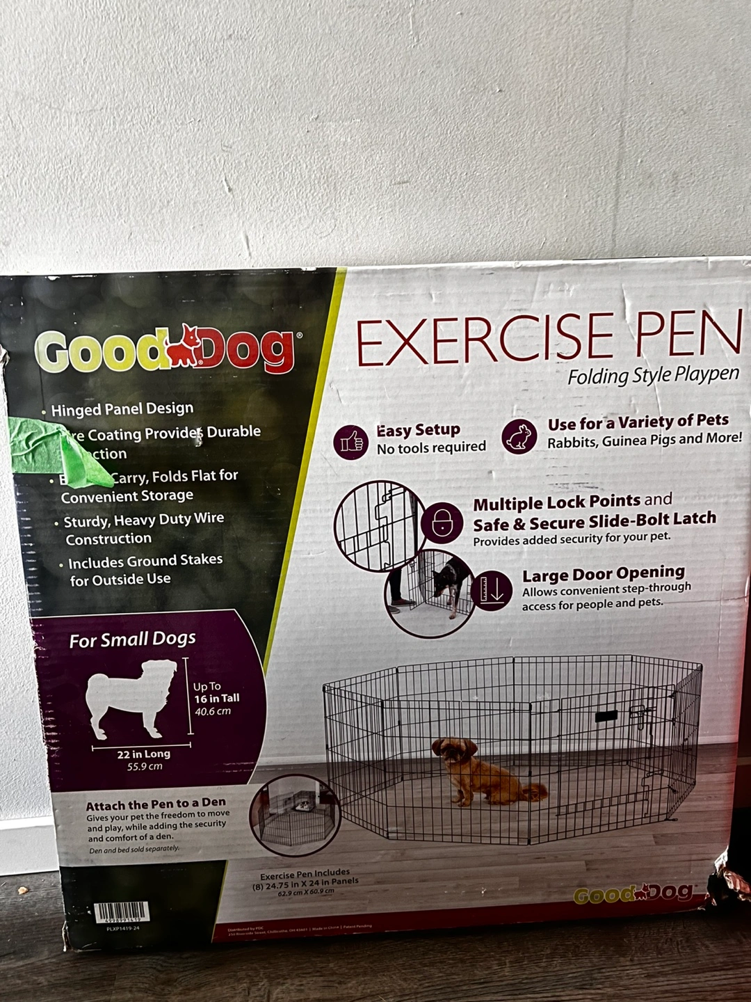 ‼️UNOPENED AND UNUSED‼️Folding exercise pen. Easy setup, no tools required. Sturdy, heavy-duty wire construction. Includes ground stakes for outdoor use. Folds flat for convenient storage.