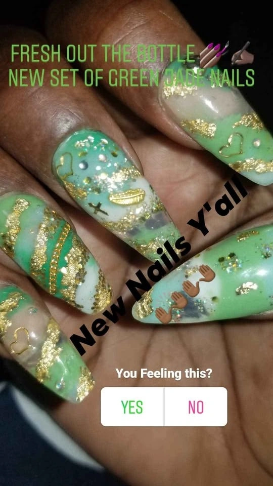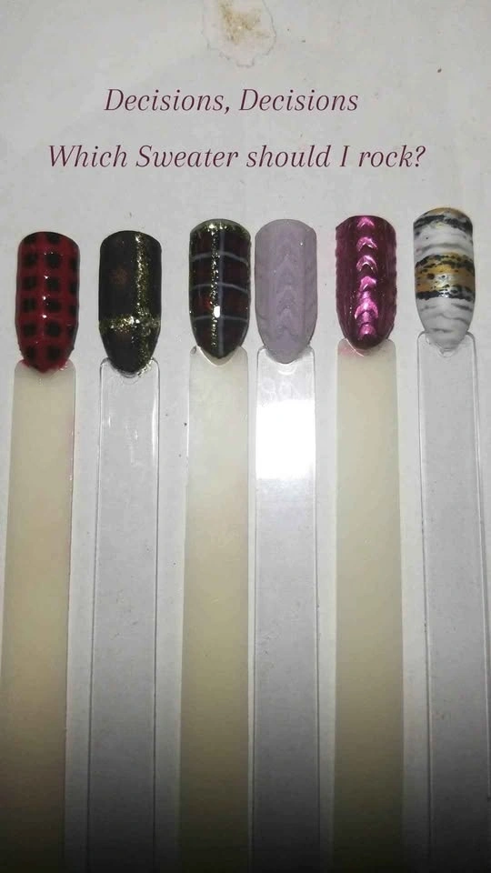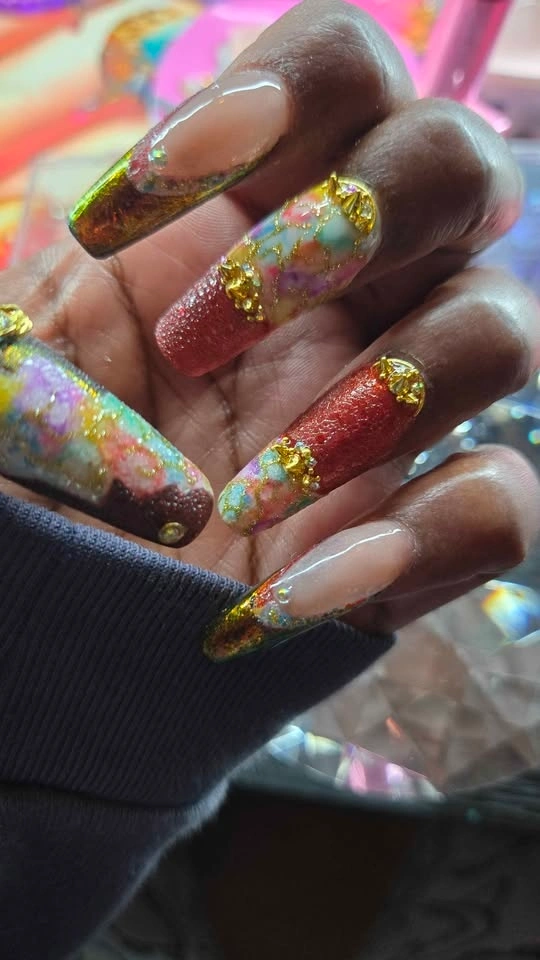 Colorful nail art designs with various patterns and shapes. Some nails have glitter, rhinestones, or other decorations. Different nail shapes and lengths are shown.