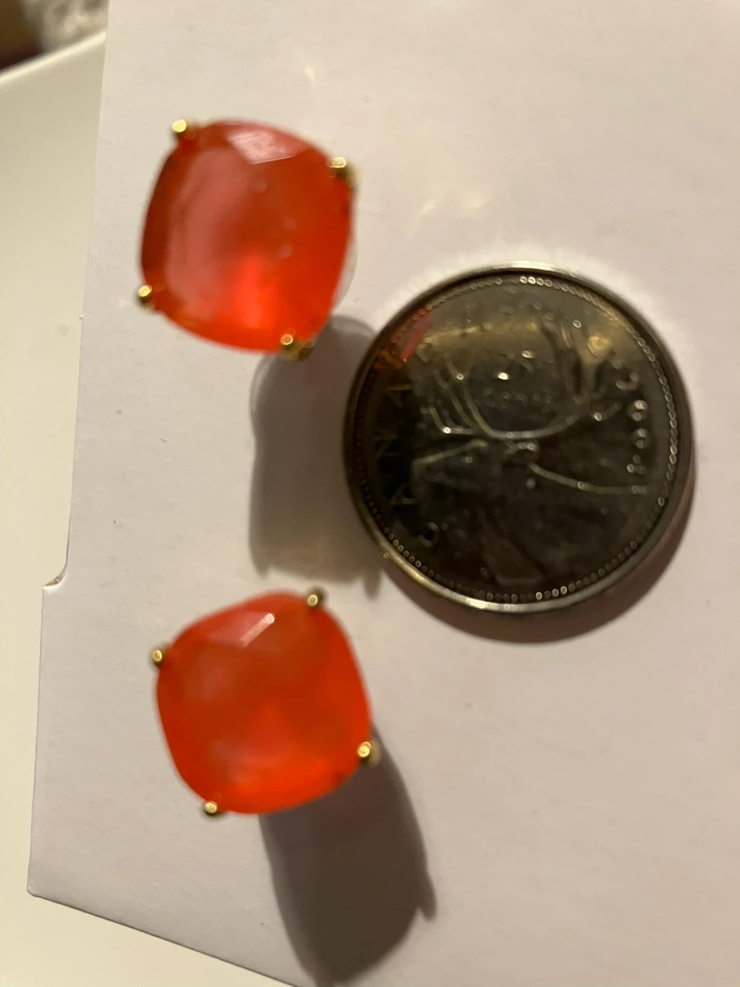 A pair of bright pink earrings featuring a cushion cut stone with gold tone setting. They're a vibrant accent for any outfit. These earrings would add a pop of colour to your look!