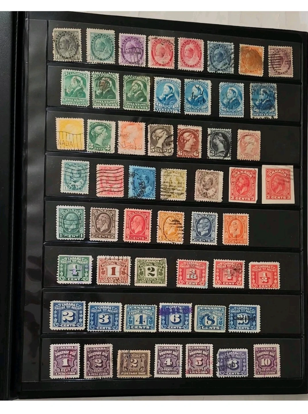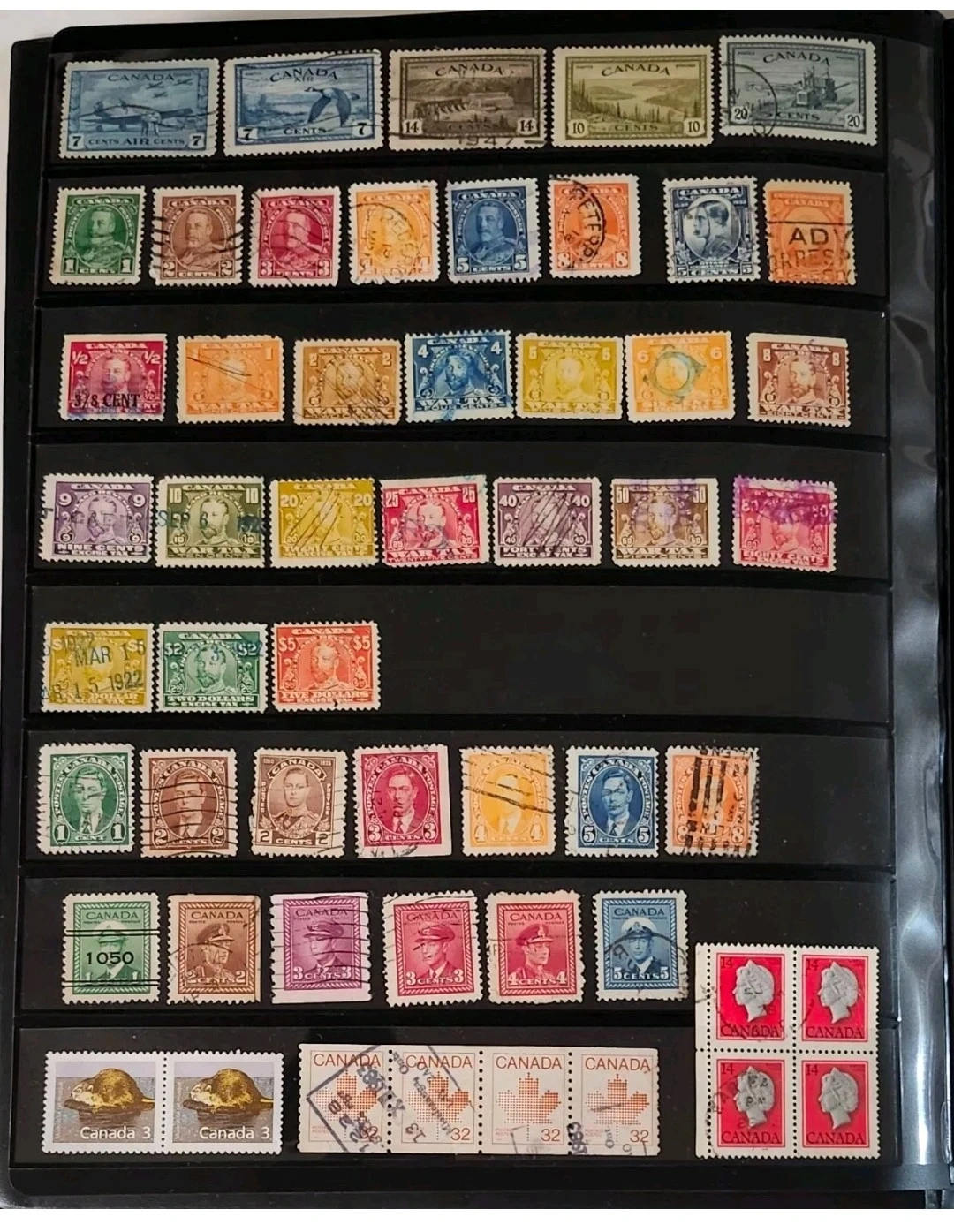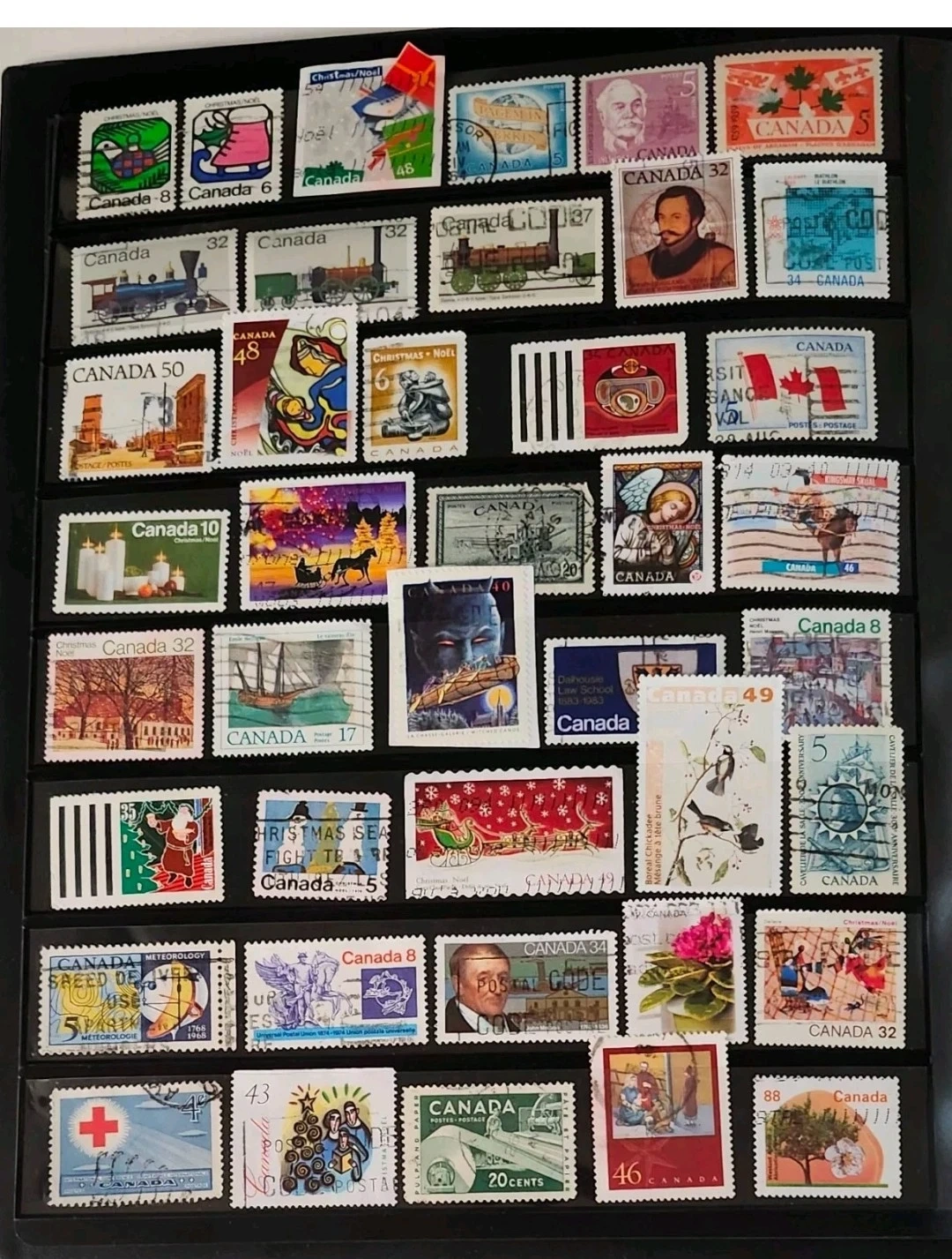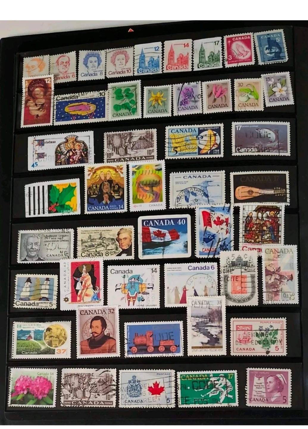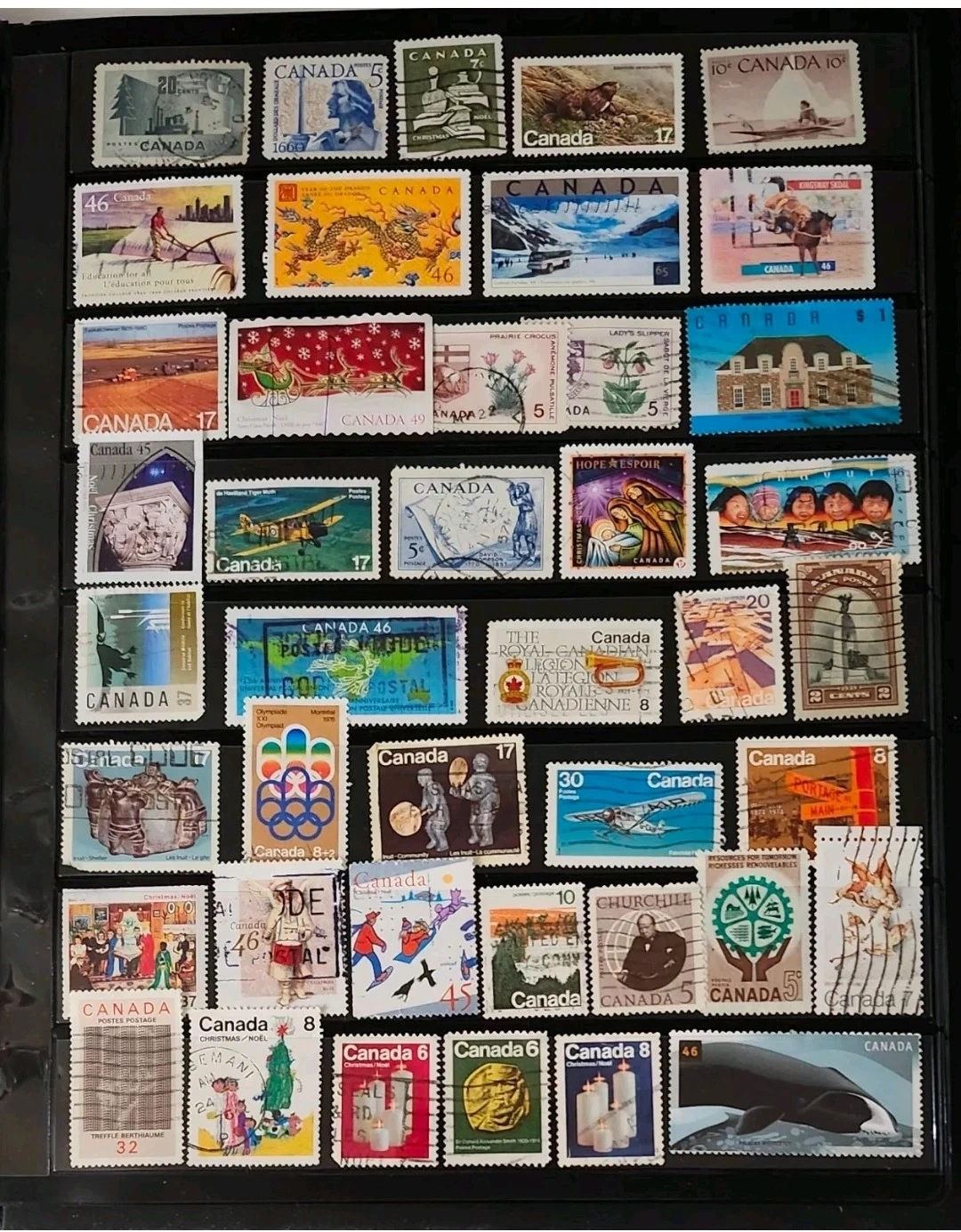 This is a large collection of various Canadian postage stamps. Stamps feature diverse imagery including historical figures, landmarks, and wildlife. Many different denominations and years are represented across the collection. Perfect for any stamp collector!