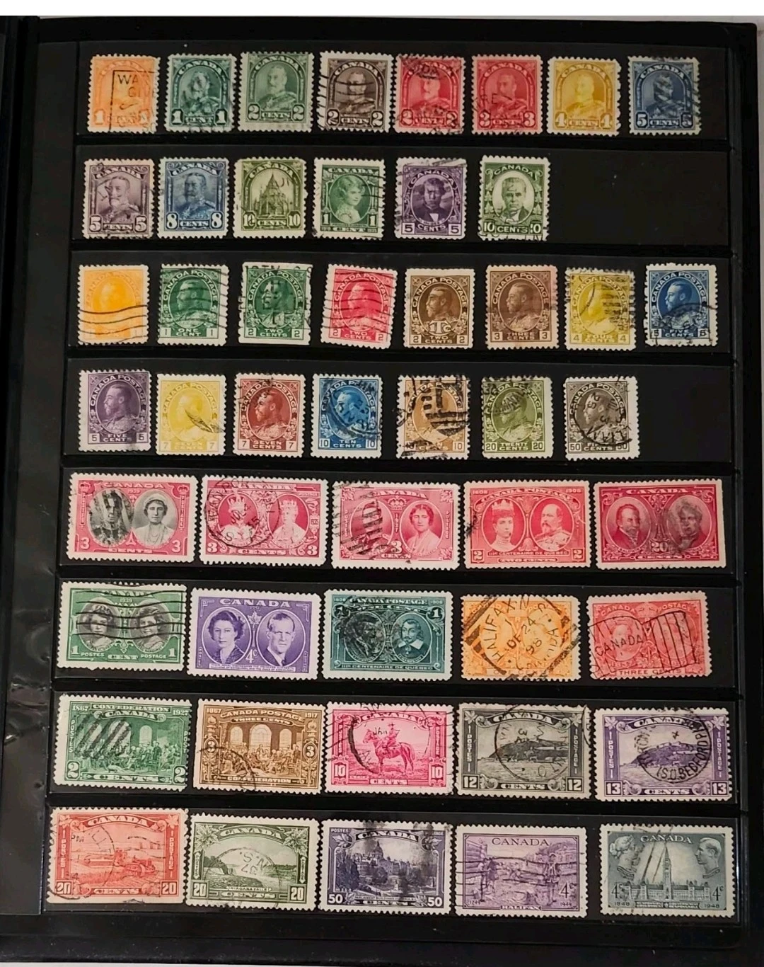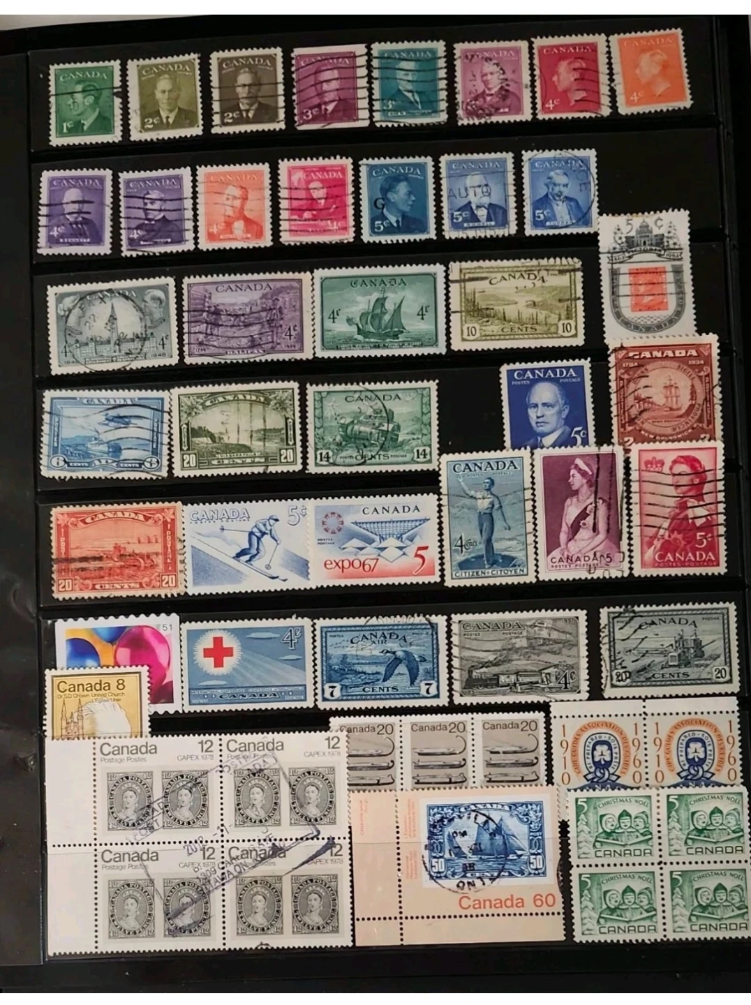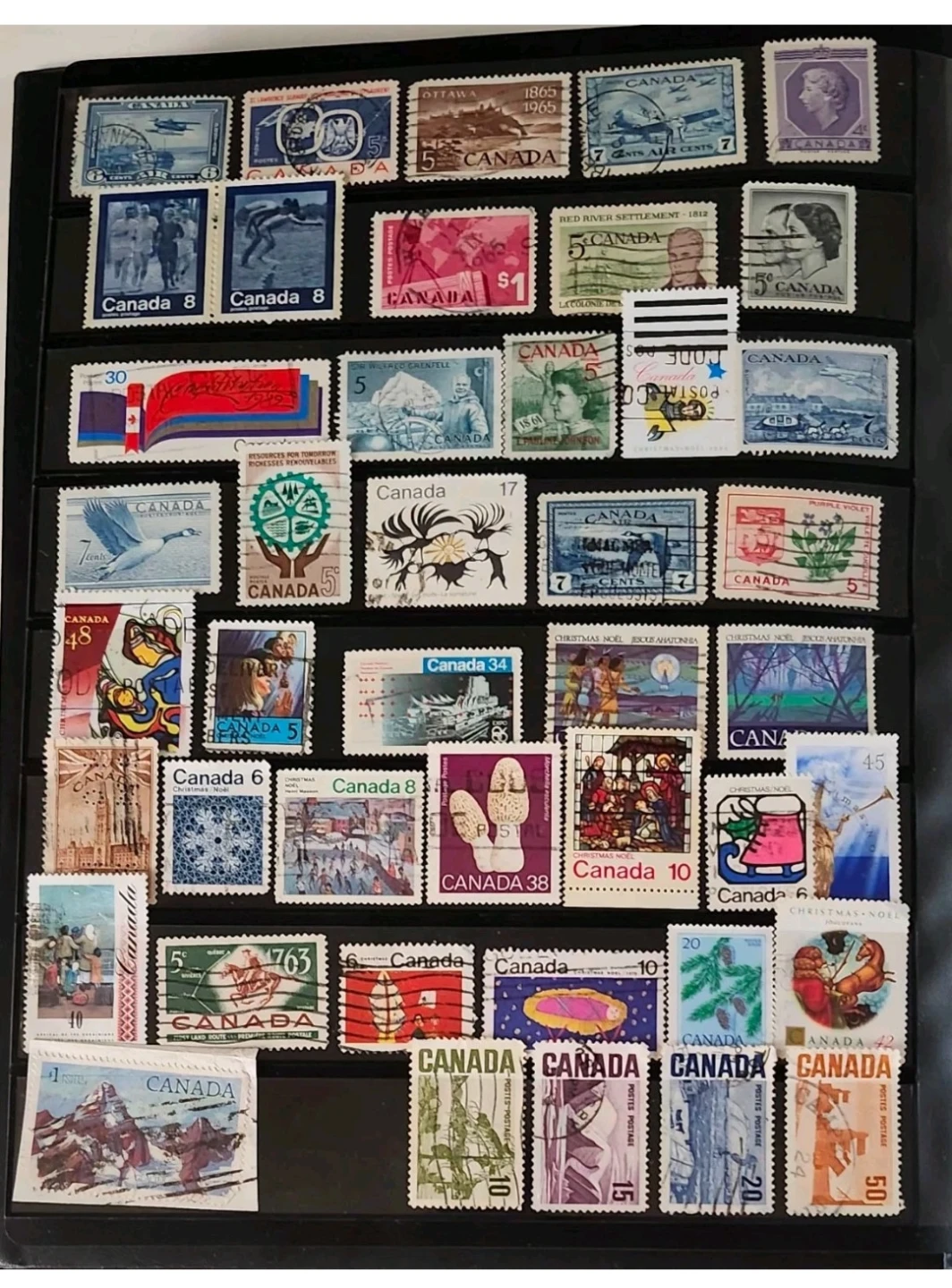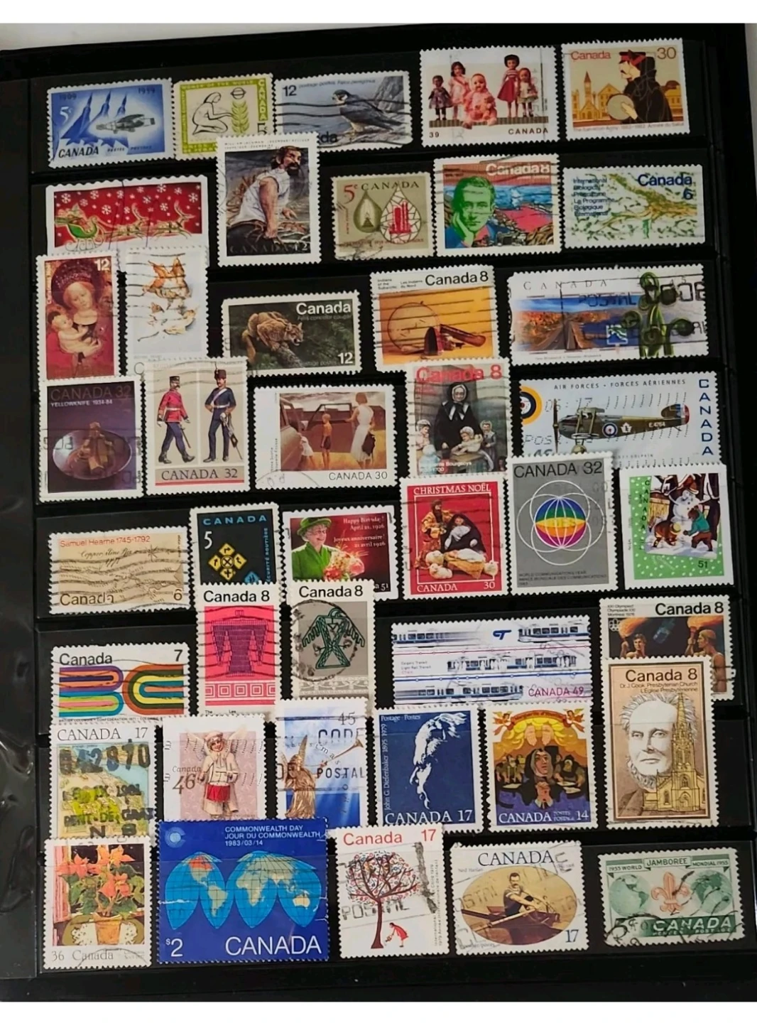 This is a large collection of various Canadian postage stamps. Stamps feature diverse imagery including historical figures, landmarks, and wildlife. Many different denominations and years are represented across the collection. Perfect for any stamp collector!