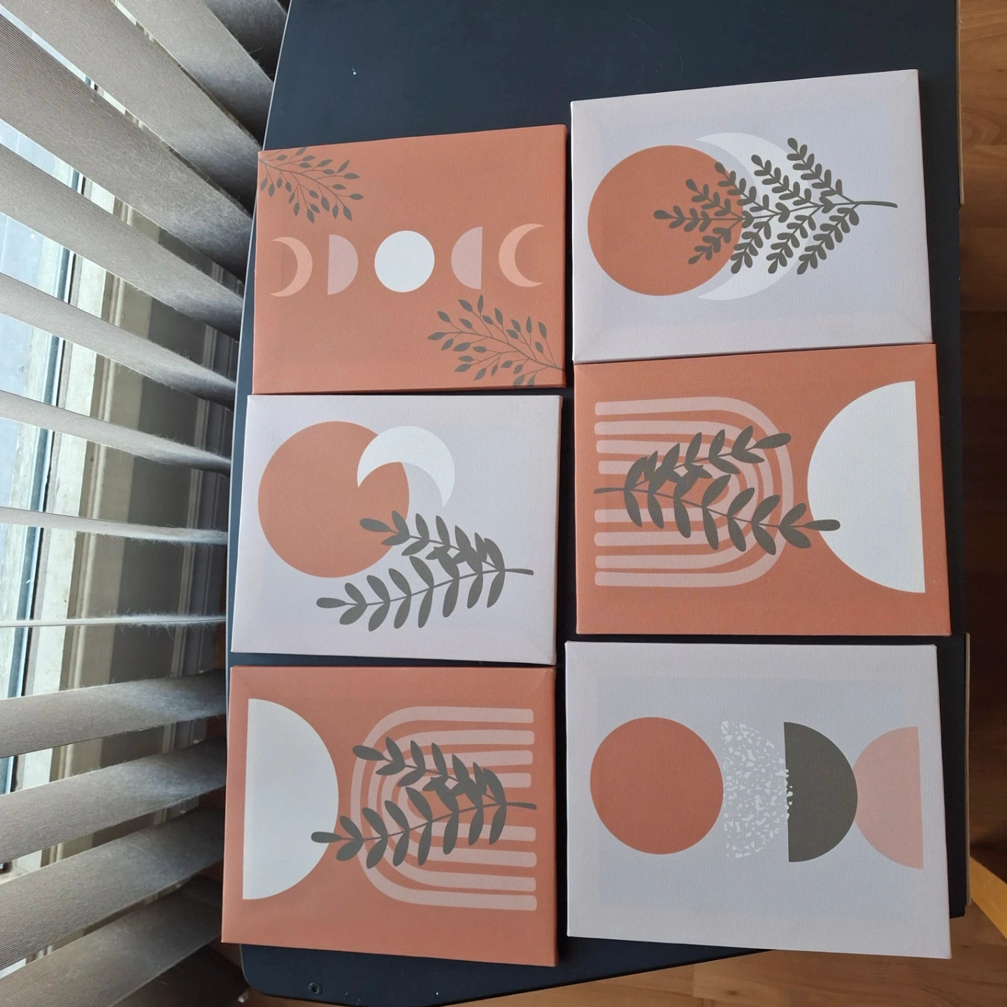 Set of six canvas prints featuring boho-style moon phases and botanical designs. ready to hang.