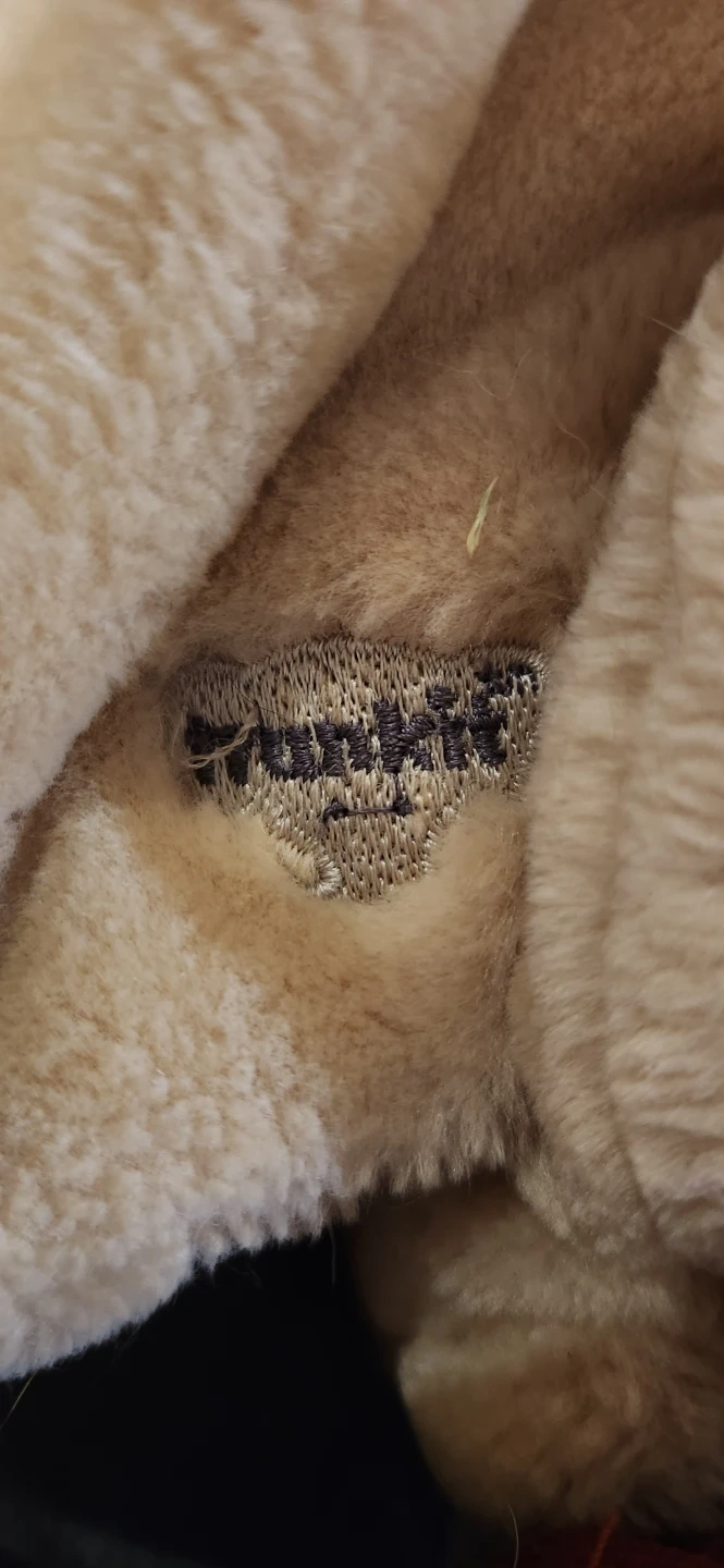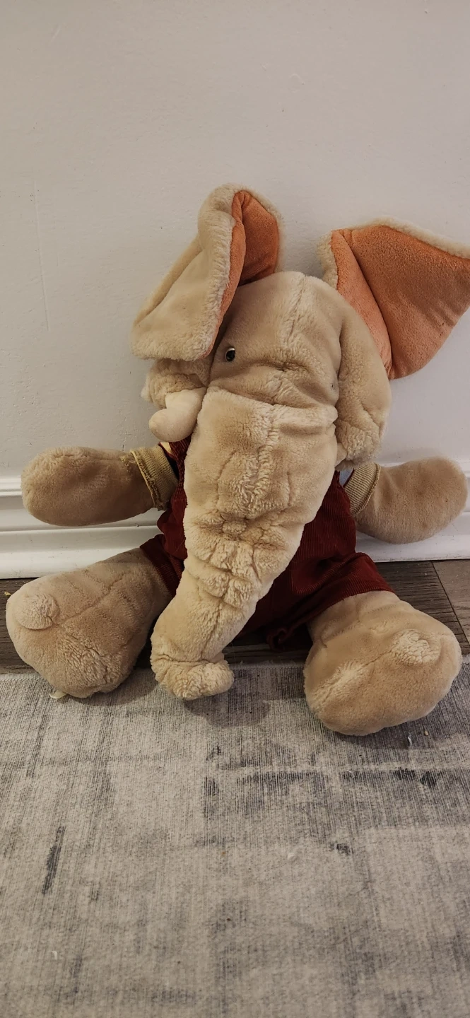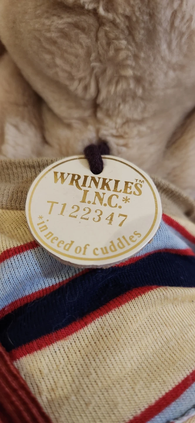 This is a Wrinkles I.N.C. plush toy with a tag that says "in need of cuddles". It's wearing a striped shirt and red corduroy overalls. It's a soft, cuddly companion.