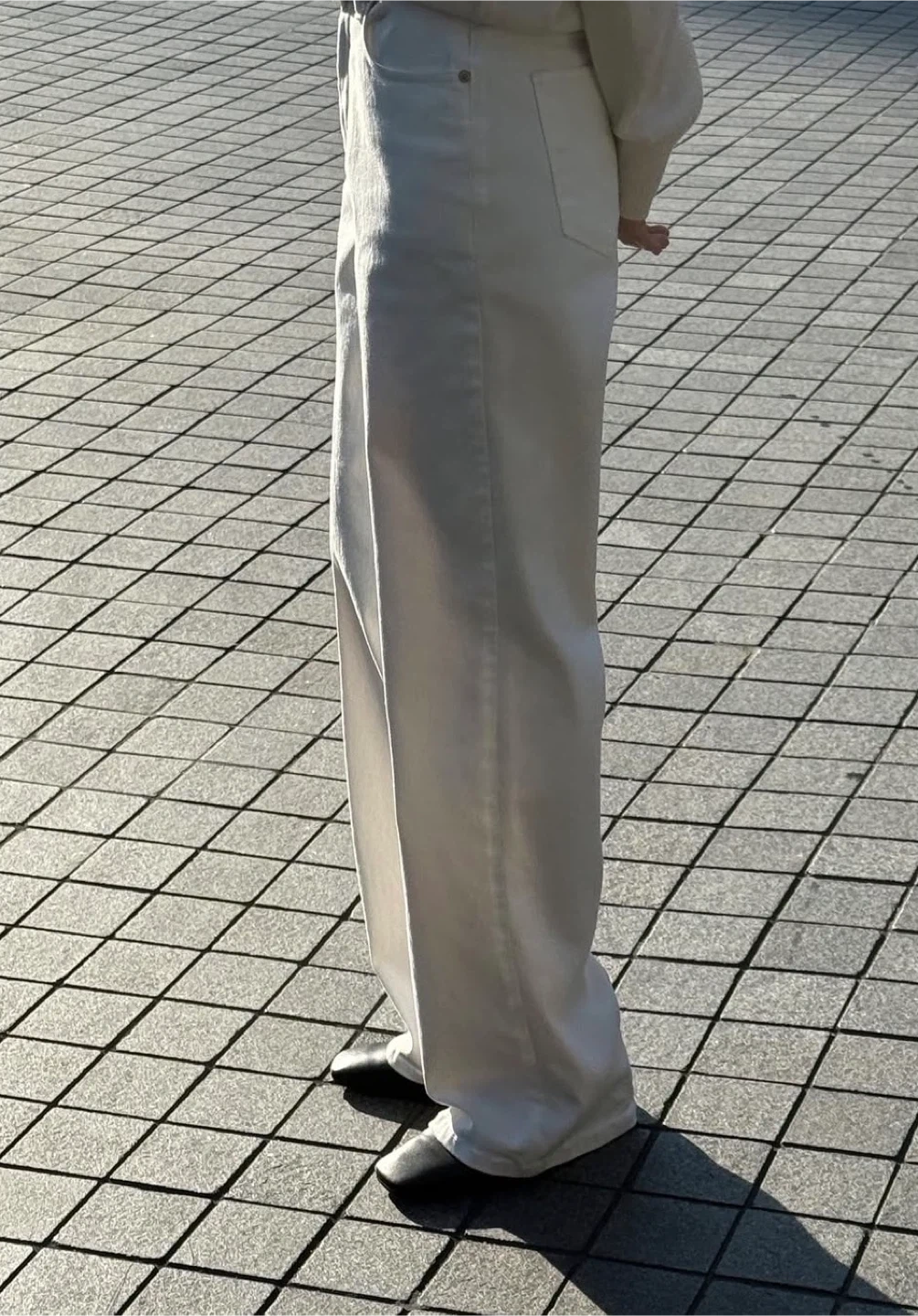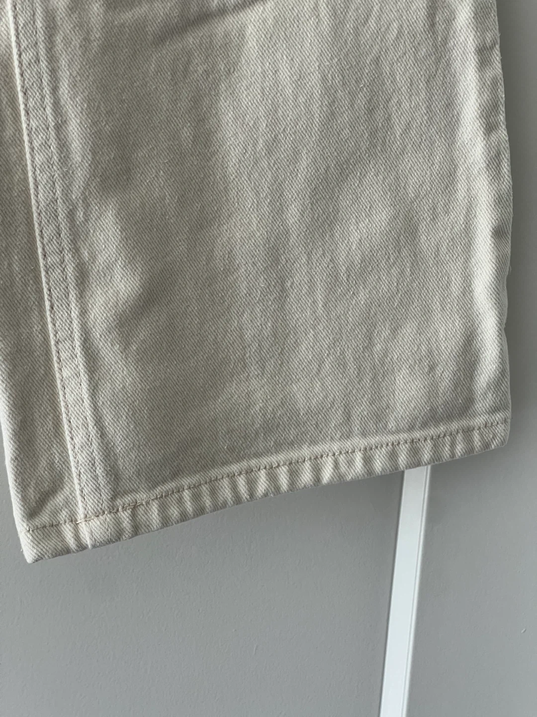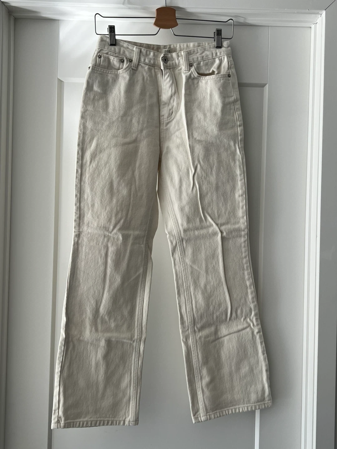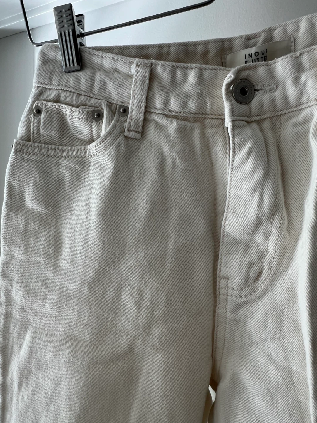 Cream coloured straight denim jeans. Classic five-pocket styling. Button and zip fly closure. These jeans are a versatile staple for any wardrobe!