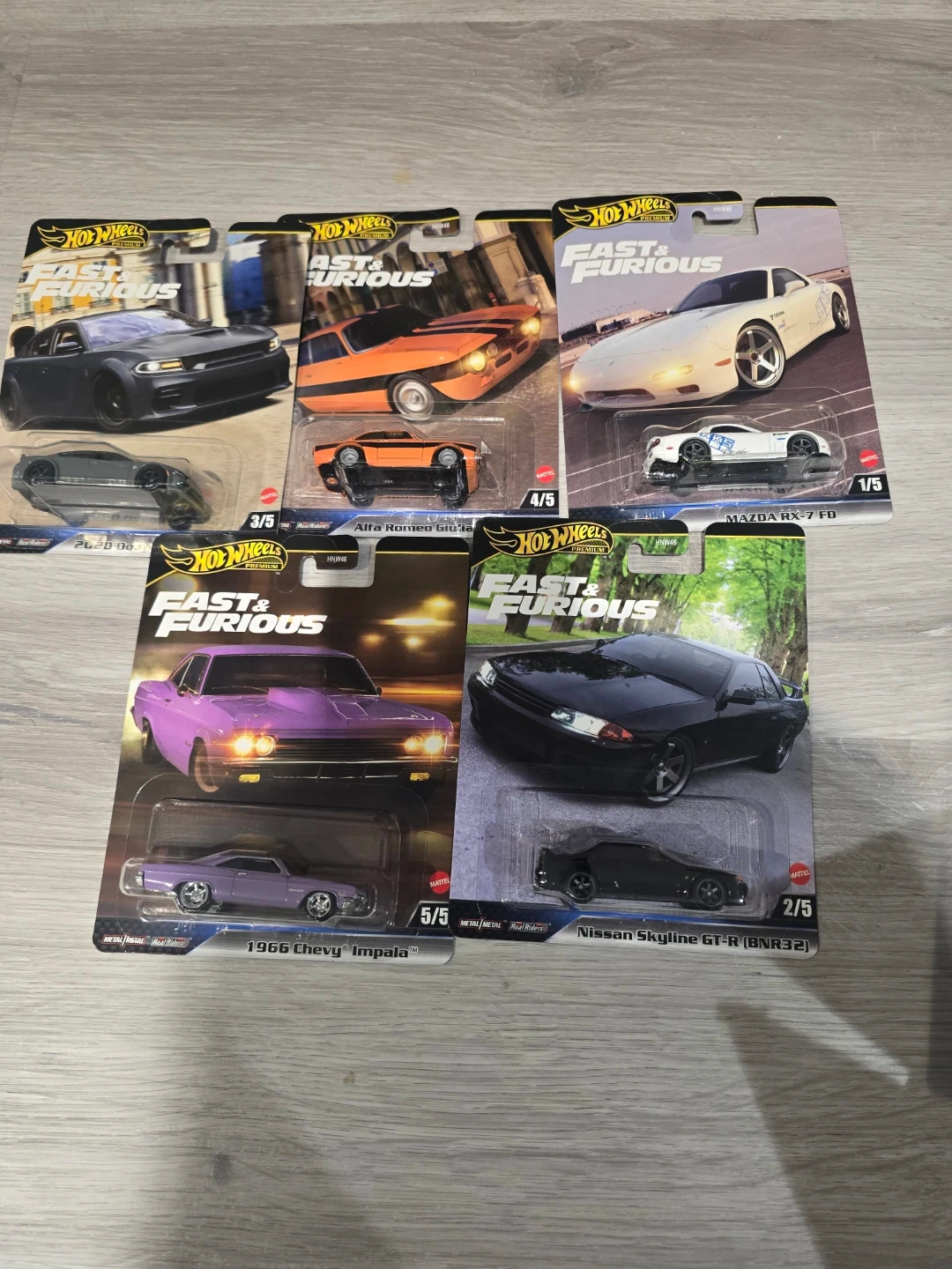 This set includes five Hot Wheels Premium 'Fast & Furious' die-cast cars. Collectible models feature detailed designs. Great for car enthusiasts and collectors!