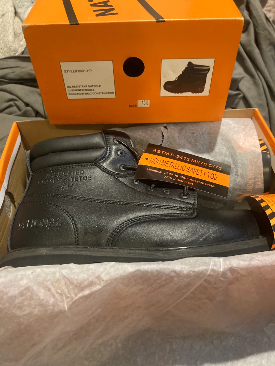 Selling a pair of National work boots in size 10.5. These boots feature an insulated composite toe and oil-resistant outsole. They also have cushioned insoles and Goodyear welt construction. Comes with the original box!