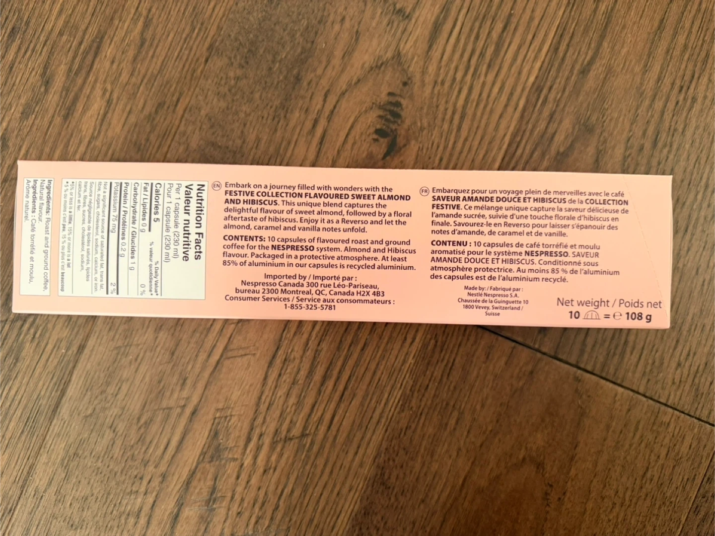 This is a box of 10 Nespresso capsules from the Festive Collection. It's flavoured with sweet almond and hibiscus. Contains 10 capsules of roast and ground coffee for Nespresso system. At least 85% of aluminum in our capsules is recycled aluminum.
