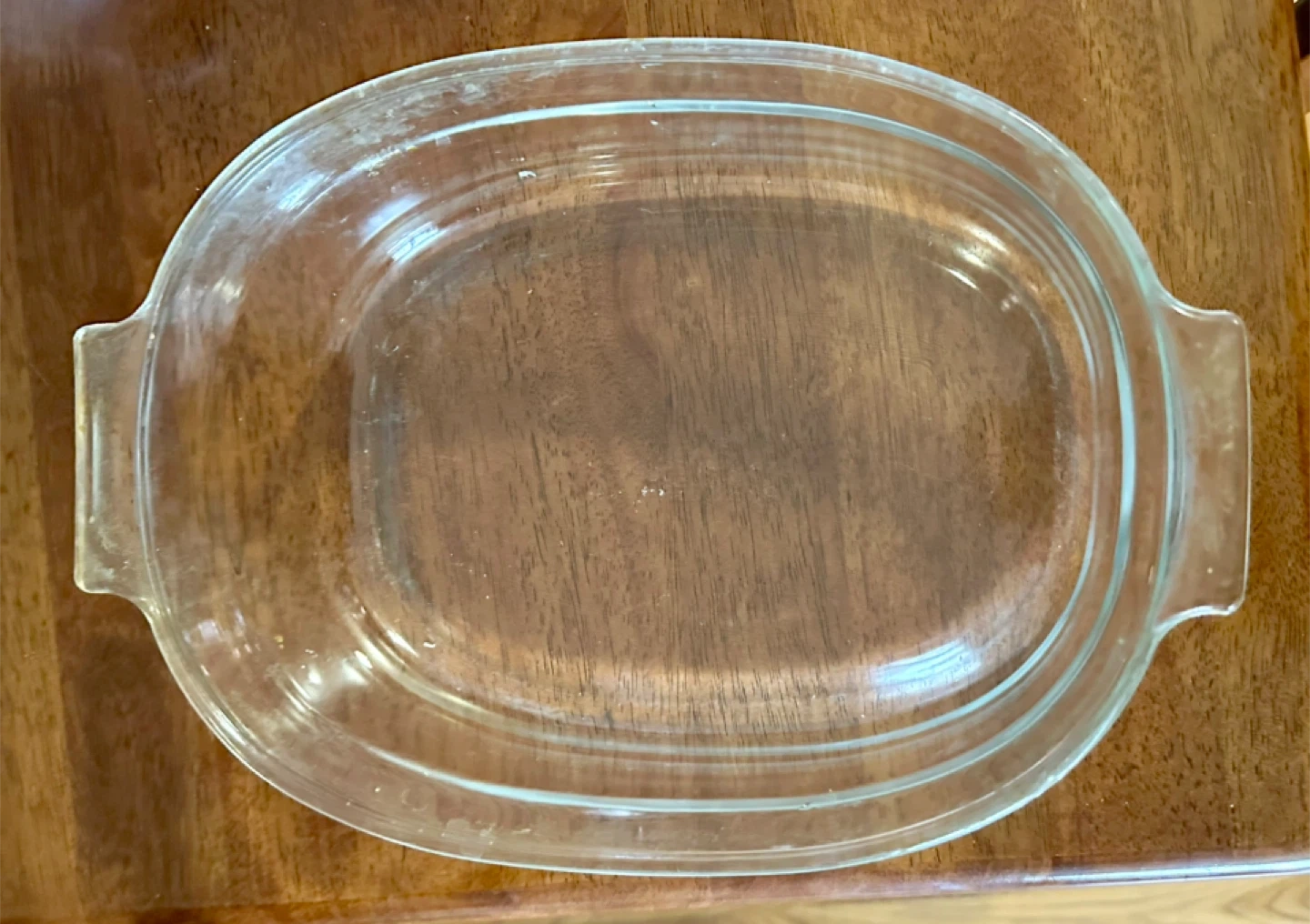 This item is a vintage Pyrex 704 Oval Roaster/Baking Dish made of clear glass with integrated handles.