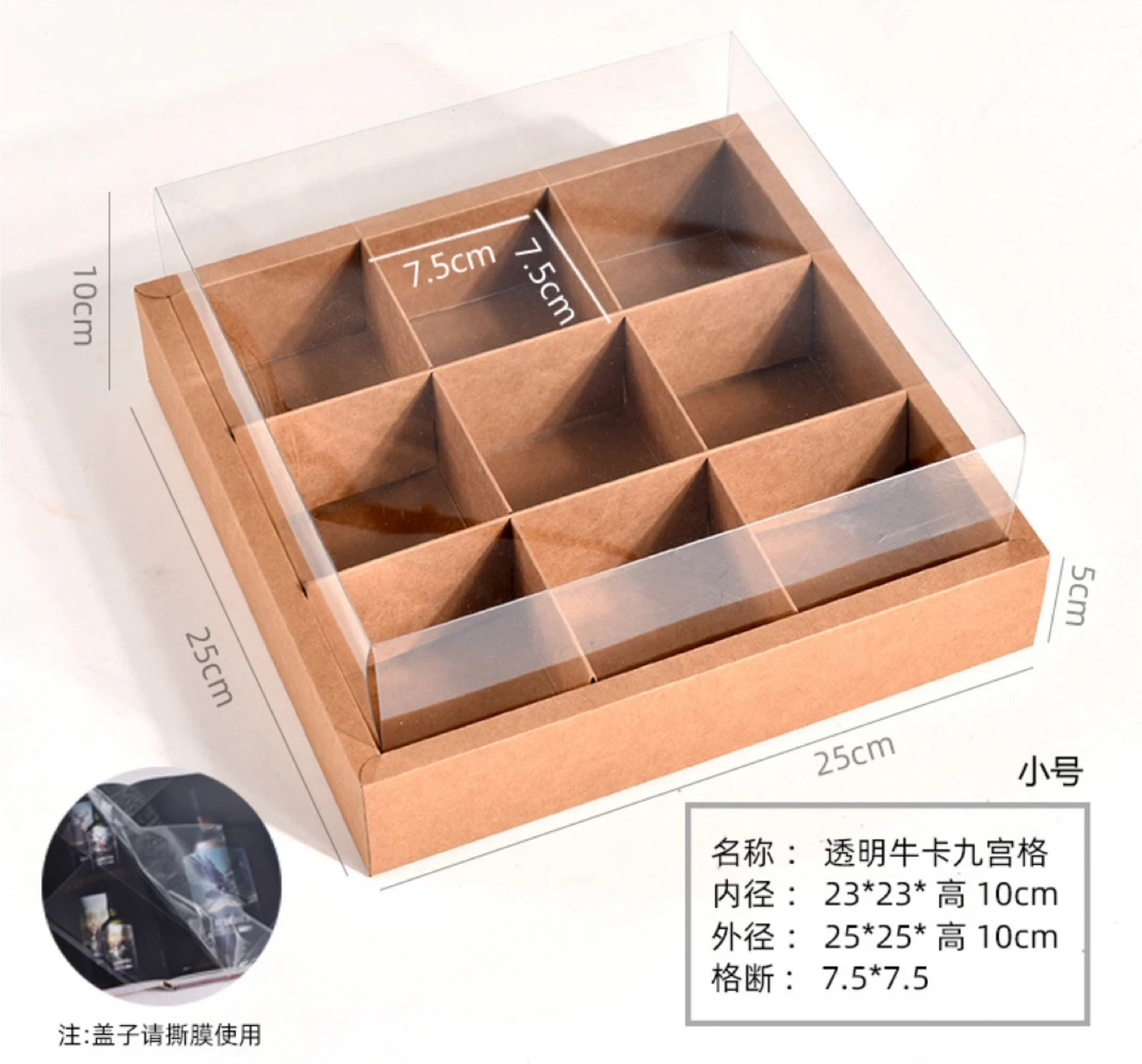 Selling a cute 9-grid box. It comes with a clear lid to keep everything looking fresh and beautiful. The box is made of sturdy cardboard and each grid measures 7.5cm x 7.5cm. The overall dimensions of the box are 25cm x 25cm x 10cm.