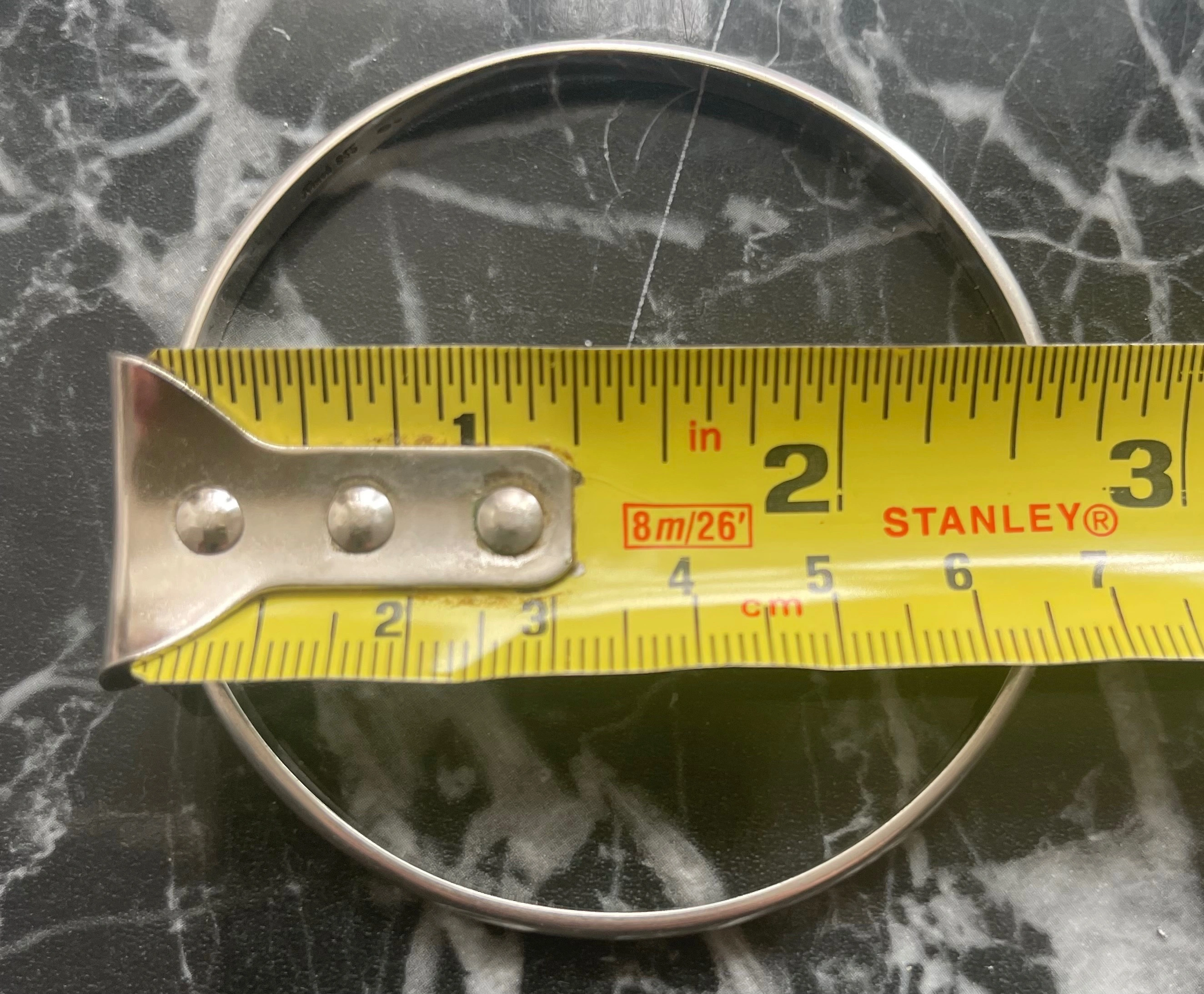 Fit: This is a solid bangle with no clasp. The internal diameter is approx 2 5/8 inches (6.7 cm), which is a common medium-to-large size.