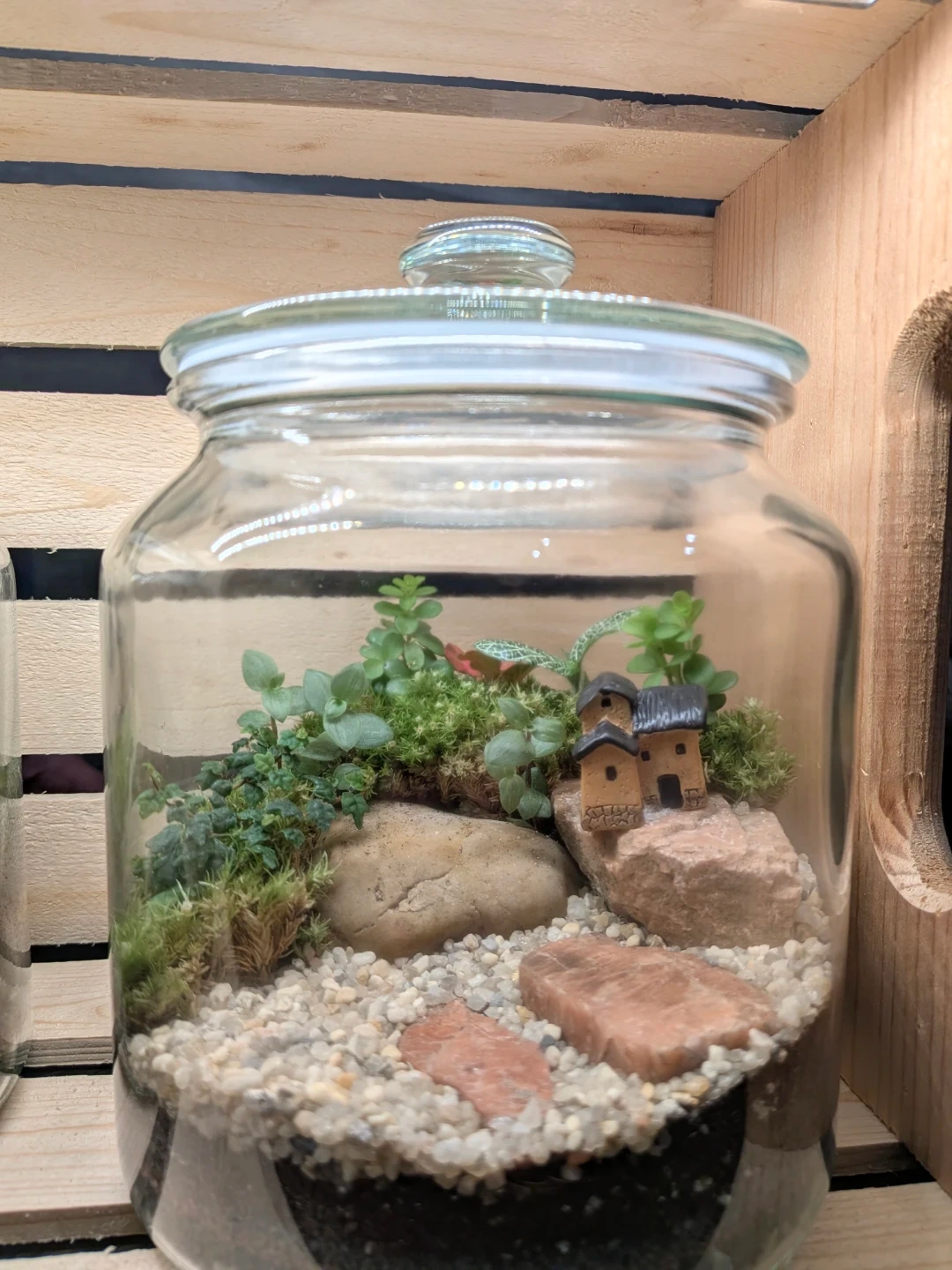 A decorative glass terrarium featuring a small village scene with tiny houses. It's filled with assorted green plants and moss, creating a miniature landscape. The jar has a clear glass lid.