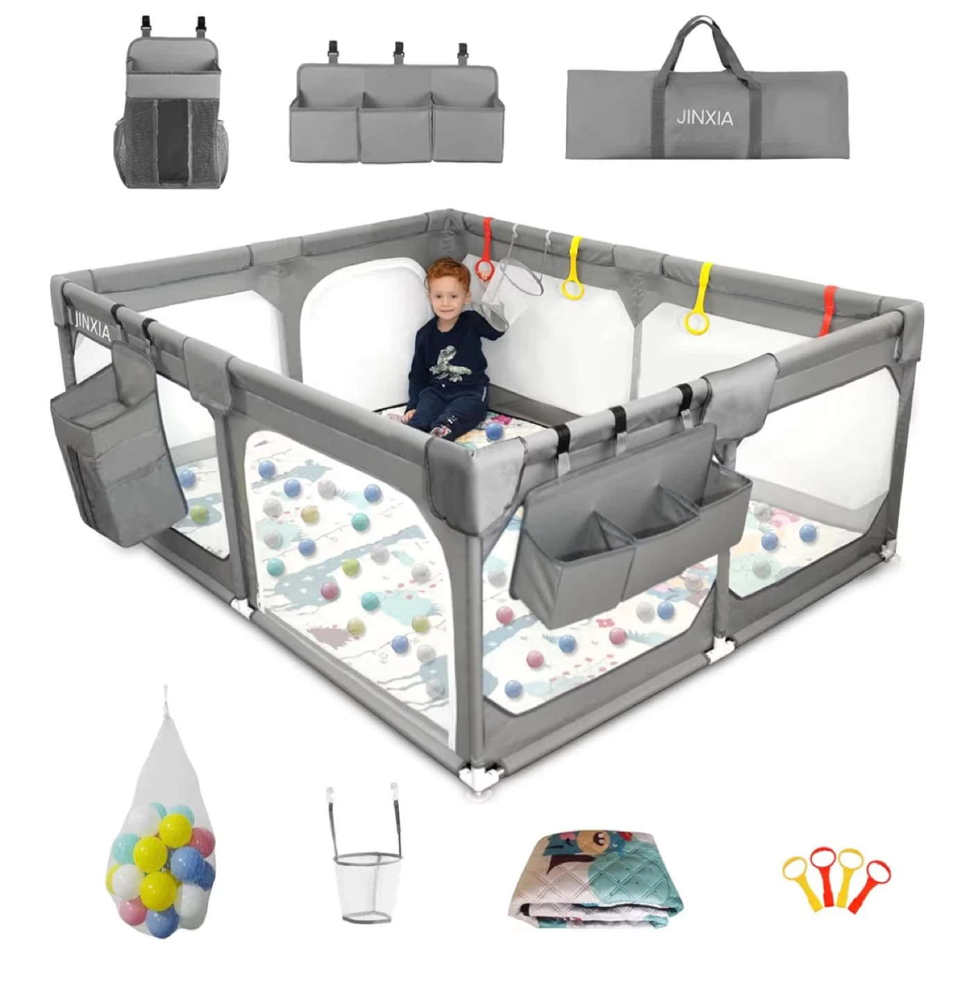 This JINXIA playpen measures 190cm x 150cm x 68cm. It includes storage organizers, a play mat, and a carrying bag. Comes with ball pit balls and a hanging toy basket. Perfect for keeping little ones safe and entertained!